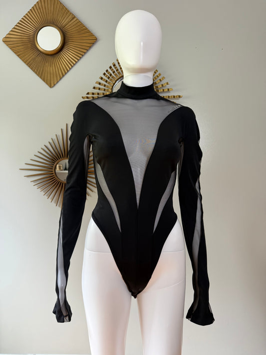 Mugler x H&M - Black Mesh Paneled Stirrup Bodysuit/Leggins Set