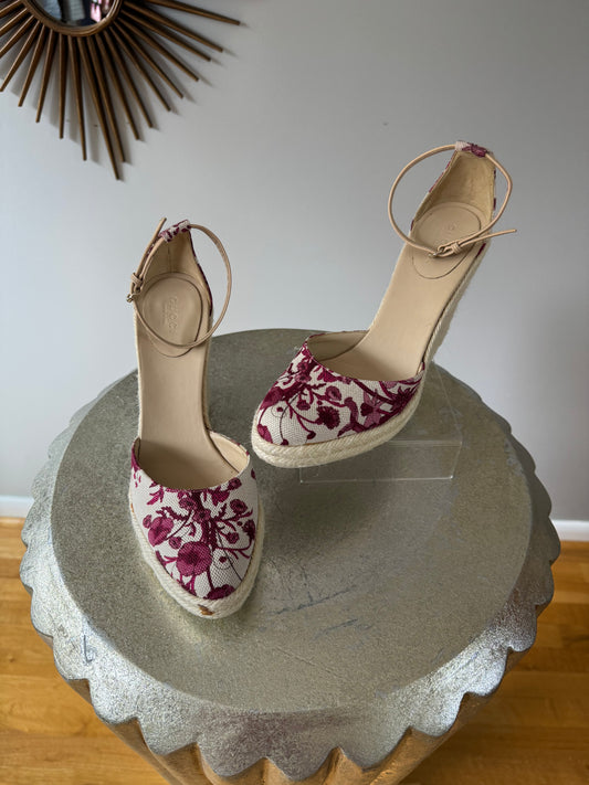 GUCCI - Red Floral Canvas Wedge Espadrilles