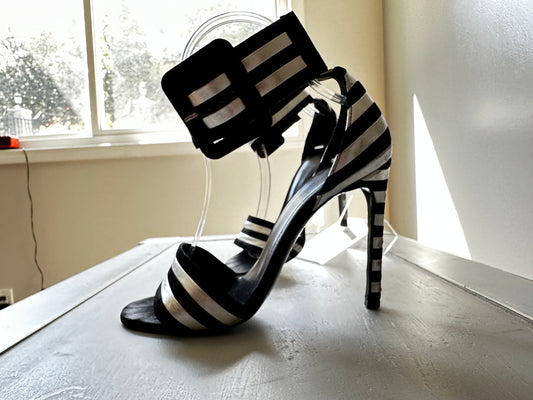 Saint Laurent - Sandalias Paloma de cuero negro y plateado con tira al tobillo a rayas