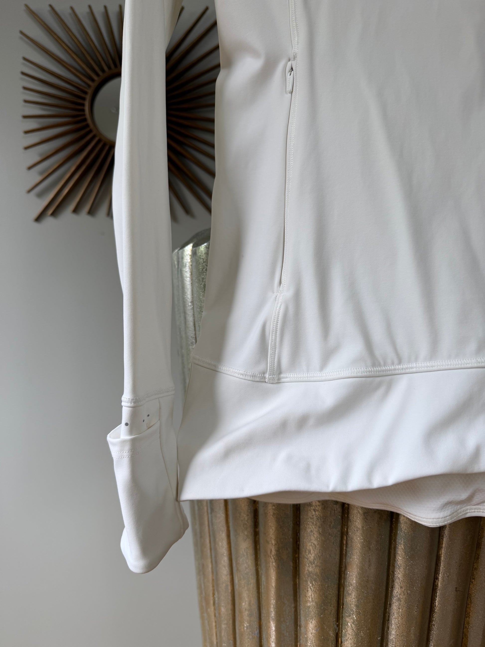 Lightweight white long-sleeve pullover with a quarter-zip front. Smooth, breathable fabric for active wear. Stand collar offers adjustable coverage. Sleek minimal design with side zip pockets. Clean, versatile look for workouts or layering.