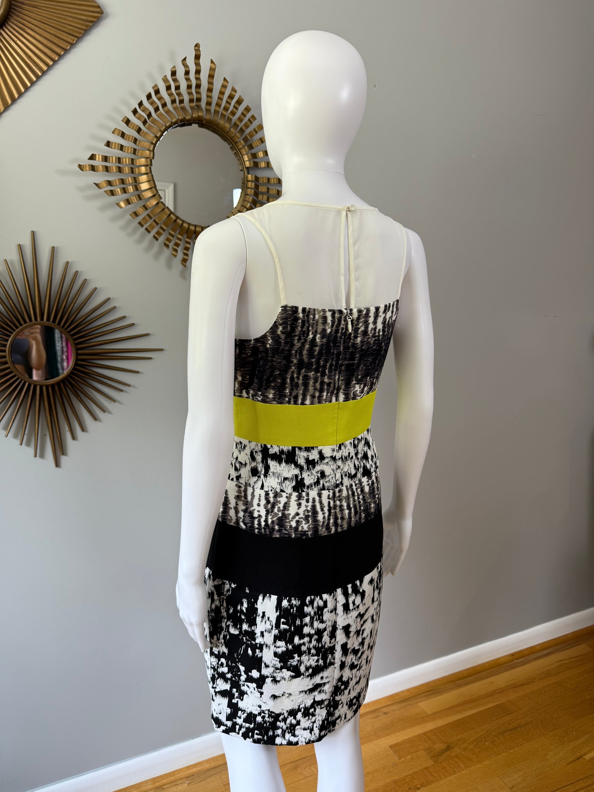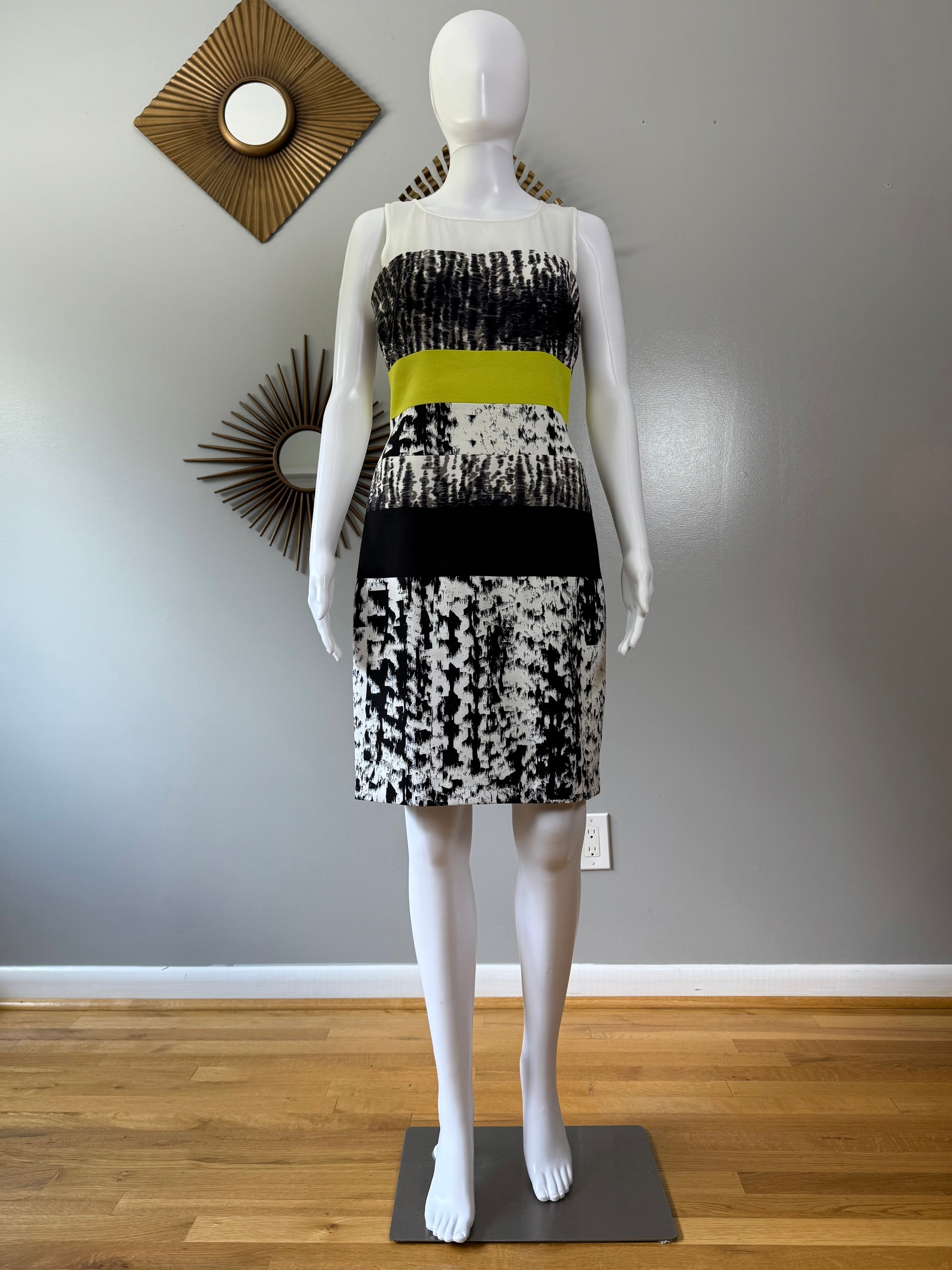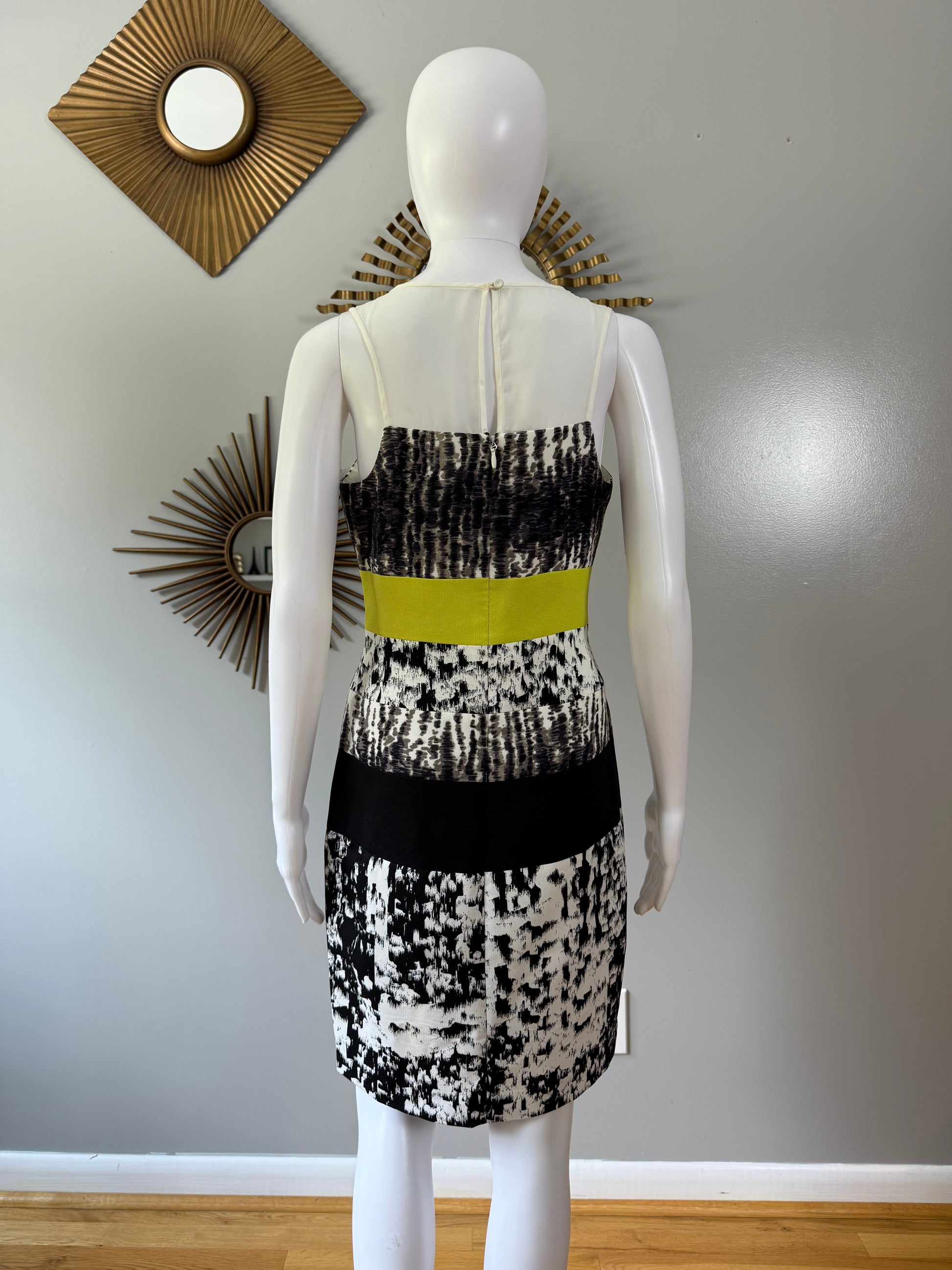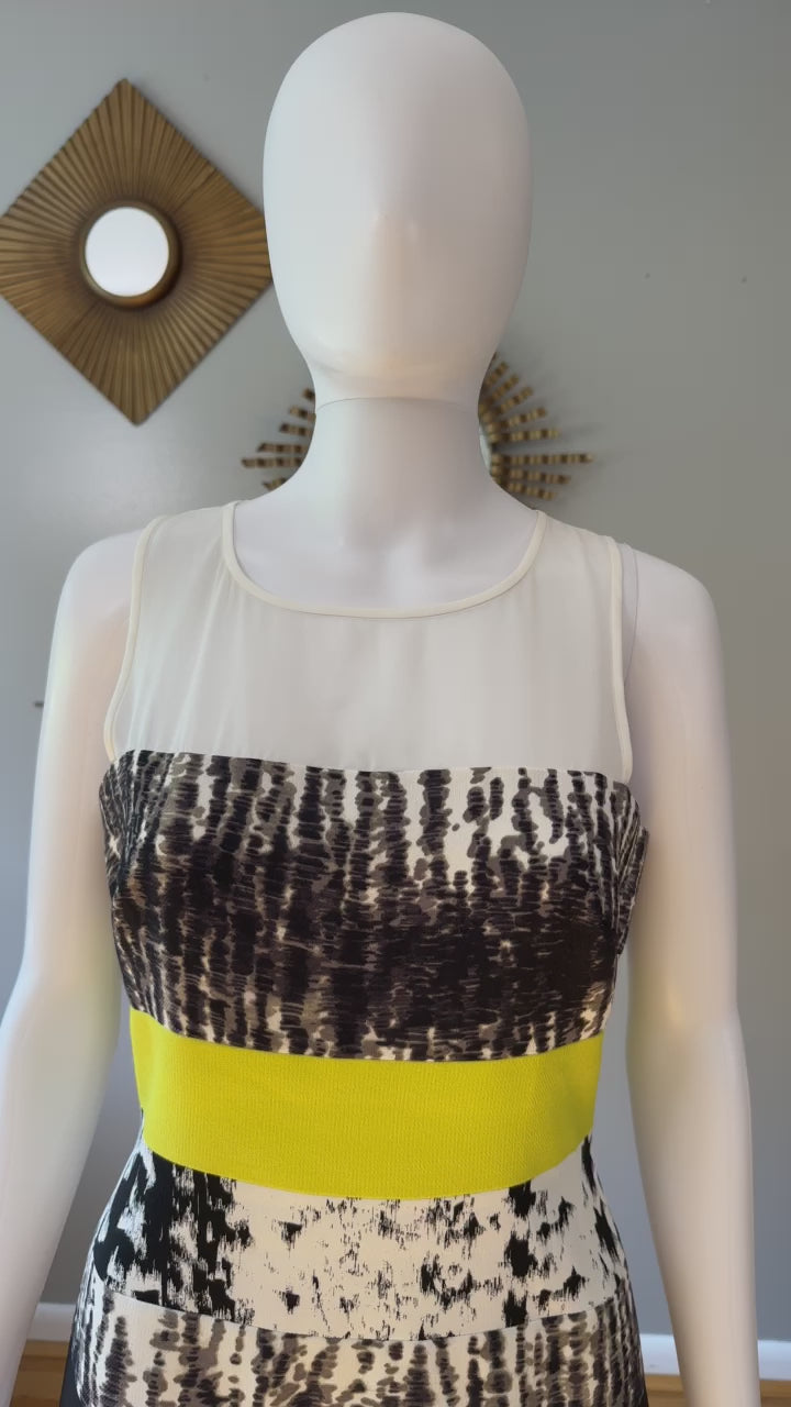 Imbued with a black and white print, this BCBGMAXAZRIA dress receives a pop of color at the waist, defining the figure in fitted perfection. Throw on a tuxedo jacket over top for a polished dinner date ensemble.
