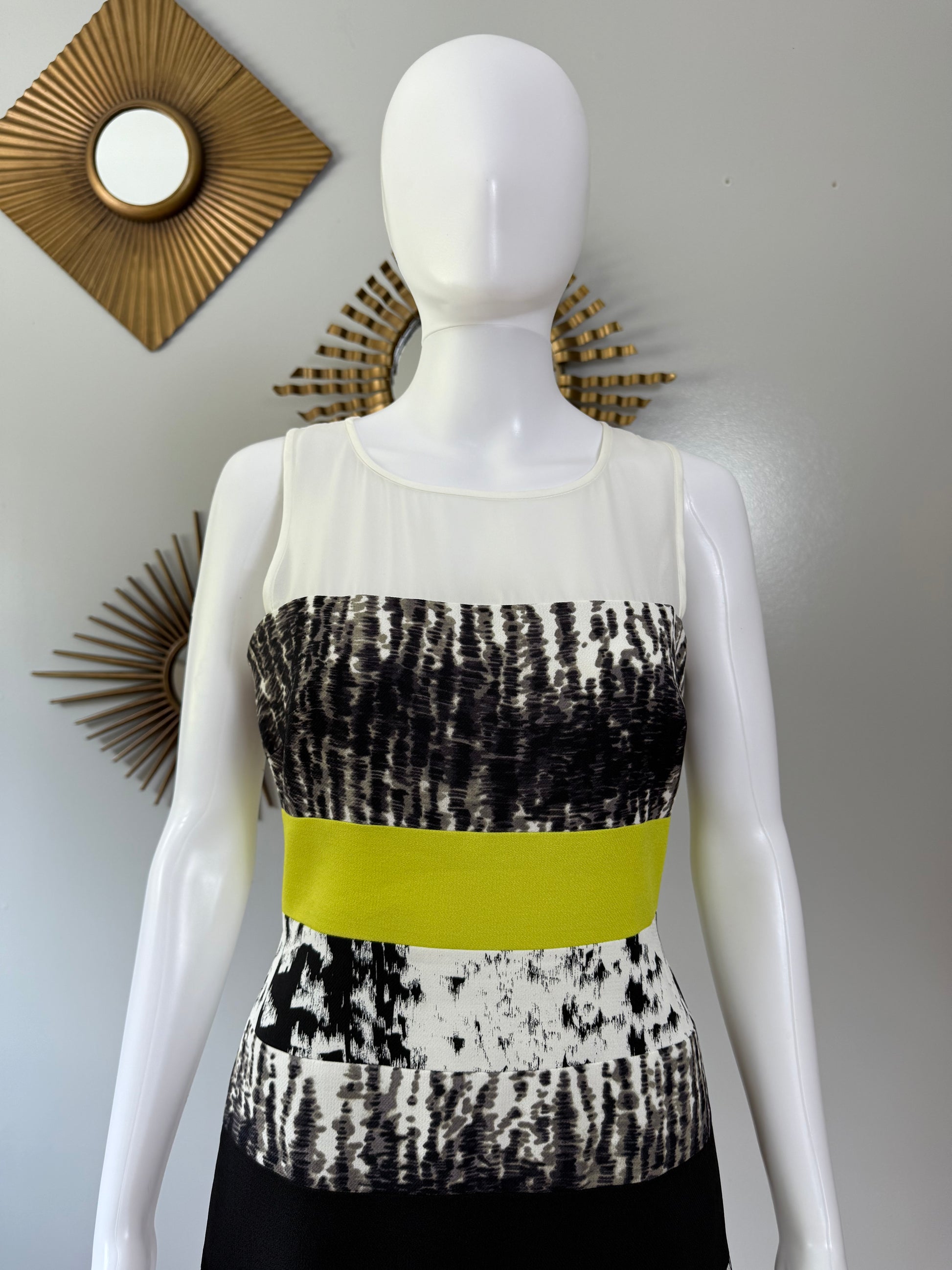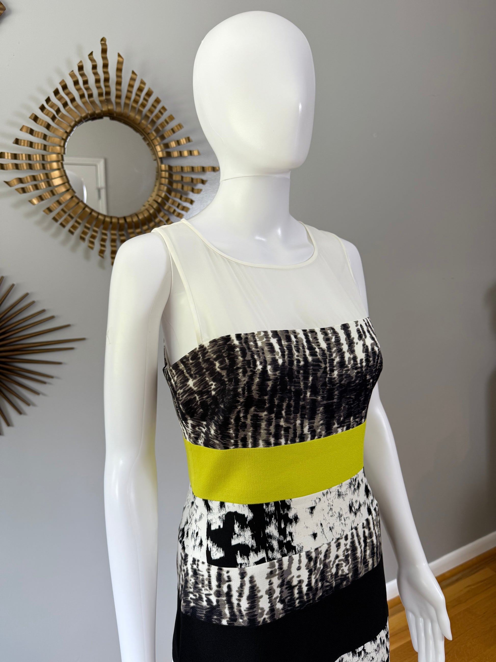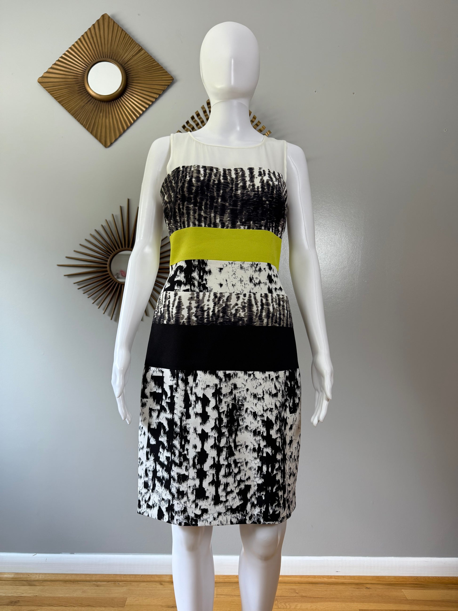 Imbued with a black and white print, this BCBGMAXAZRIA dress receives a pop of color at the waist, defining the figure in fitted perfection. Throw on a tuxedo jacket over top for a polished dinner date ensemble.