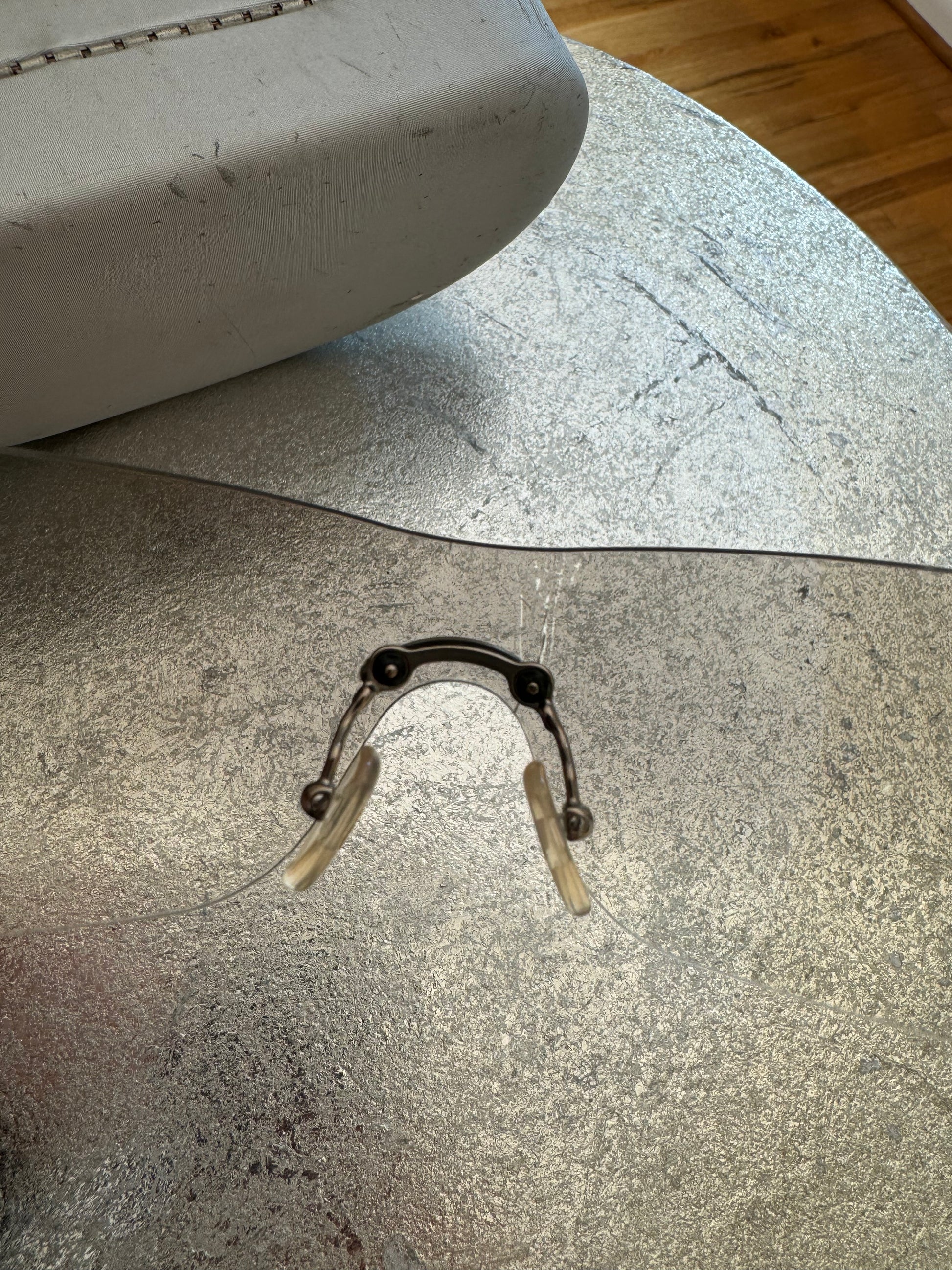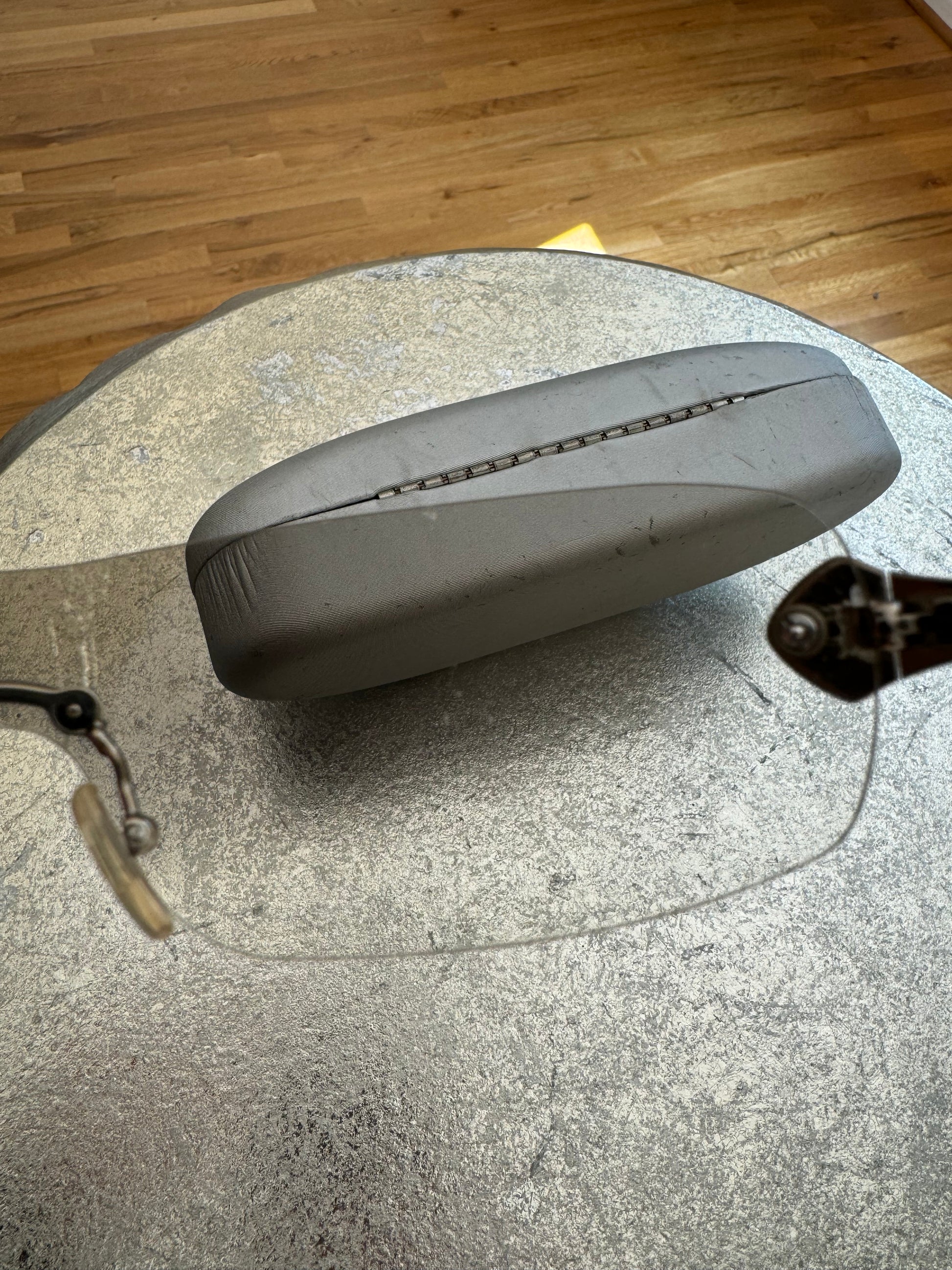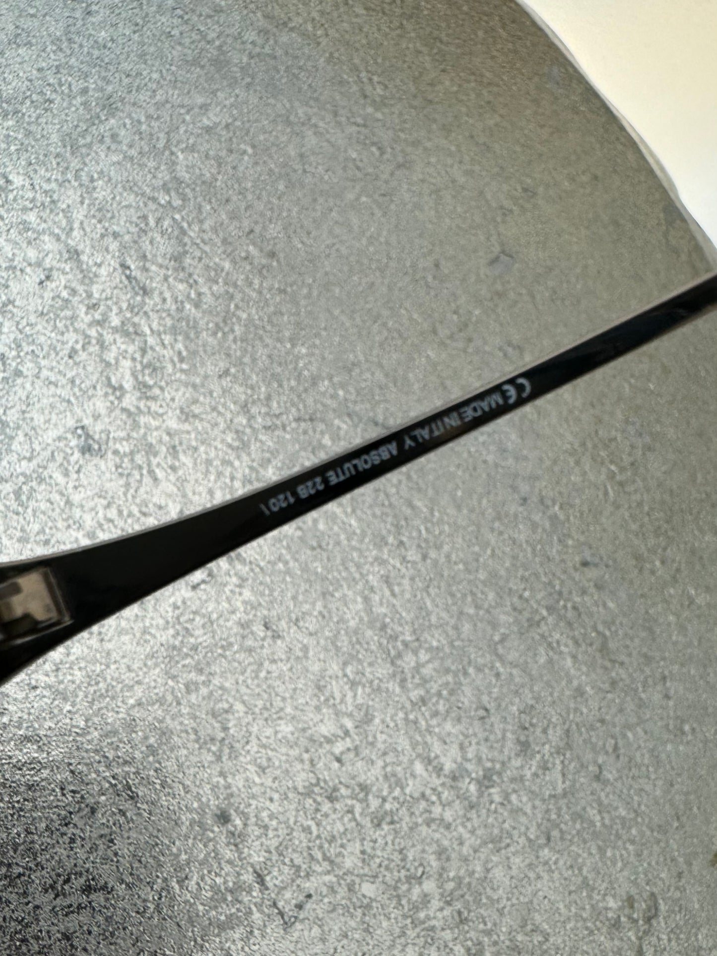 Good pre-owned condition, with one small crack on the right side of the nose, and a very small chip on the top of the right lense. The blemishes are not noticeable while wearing and do not affect visibility.
