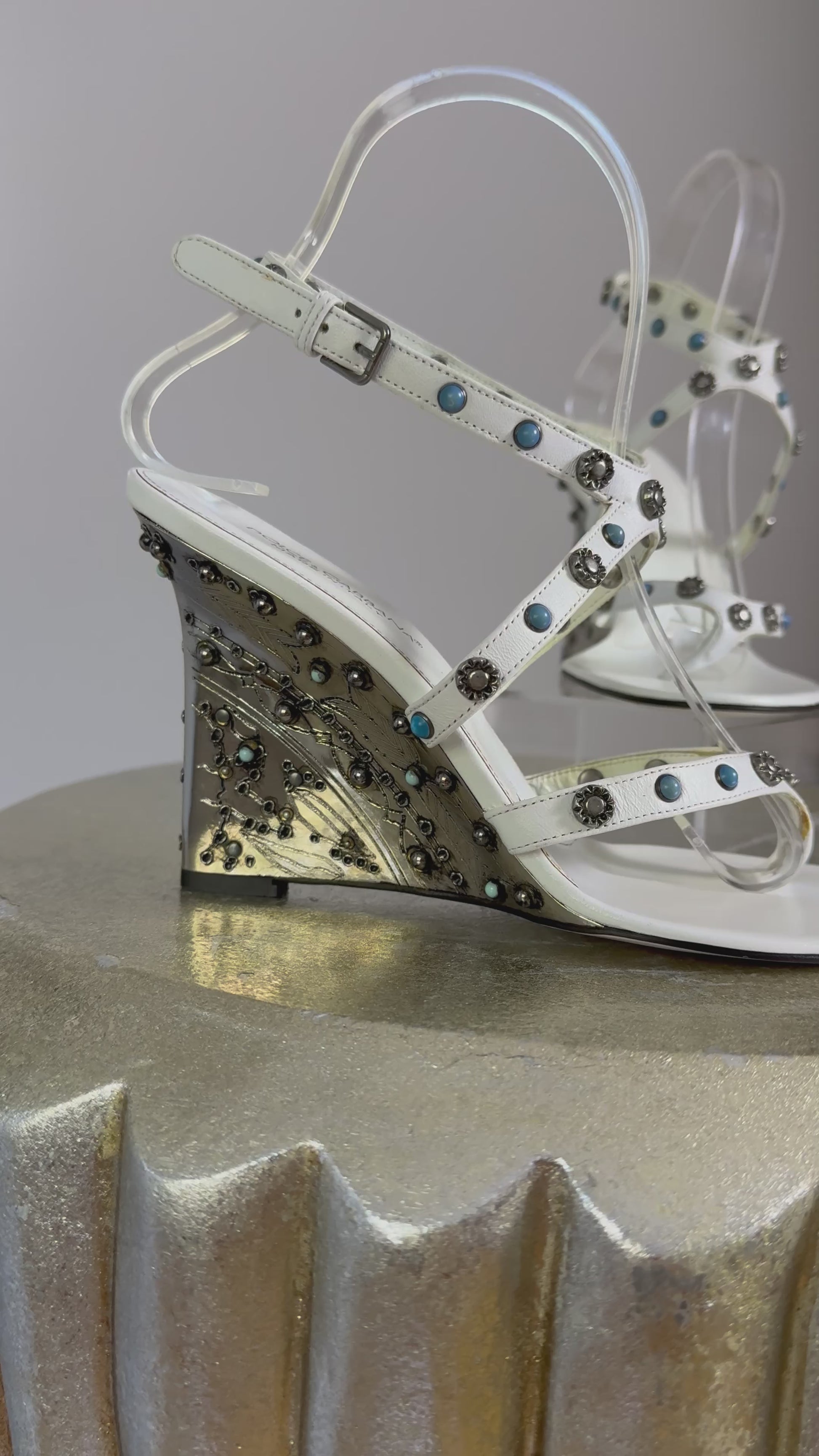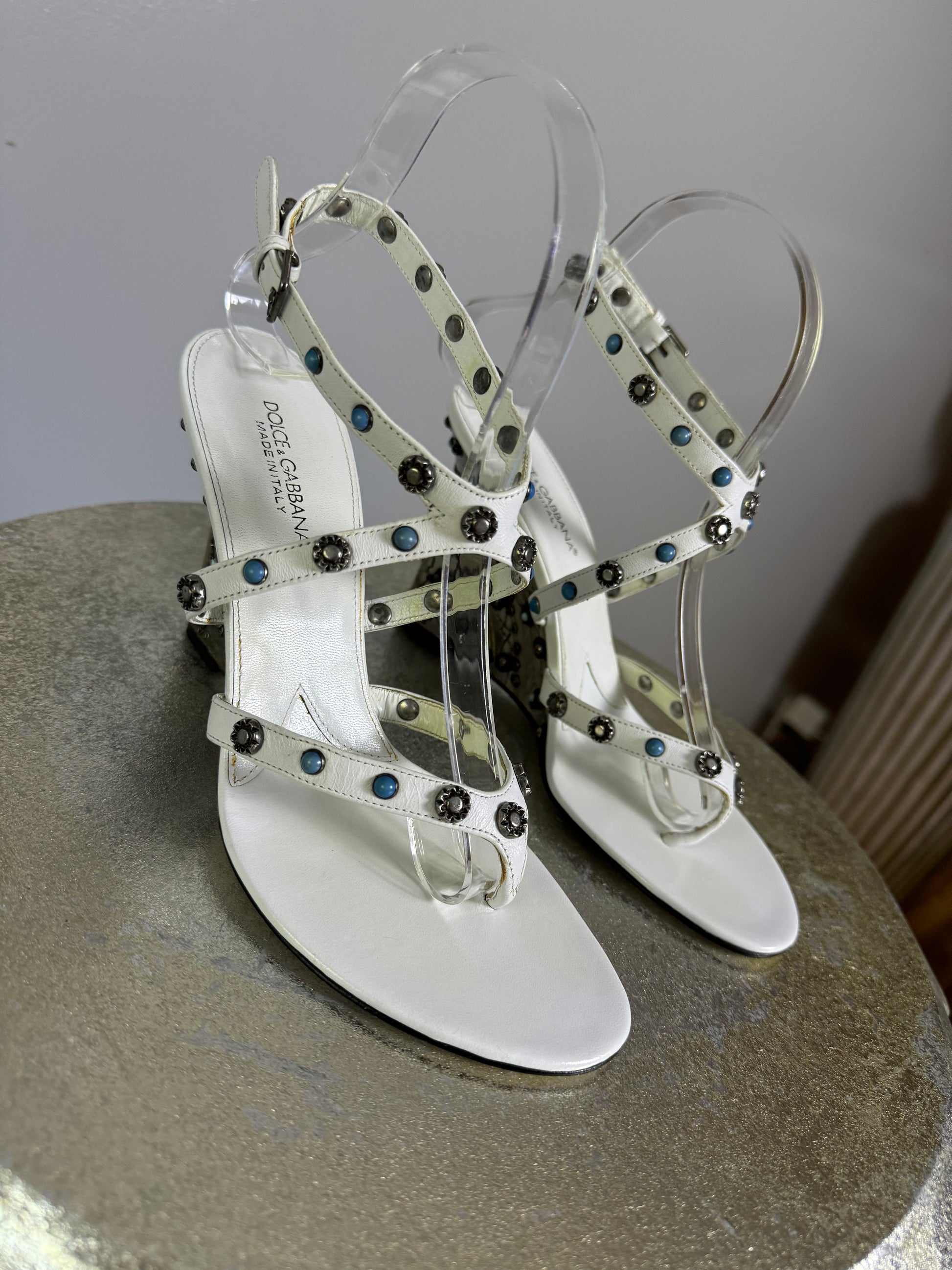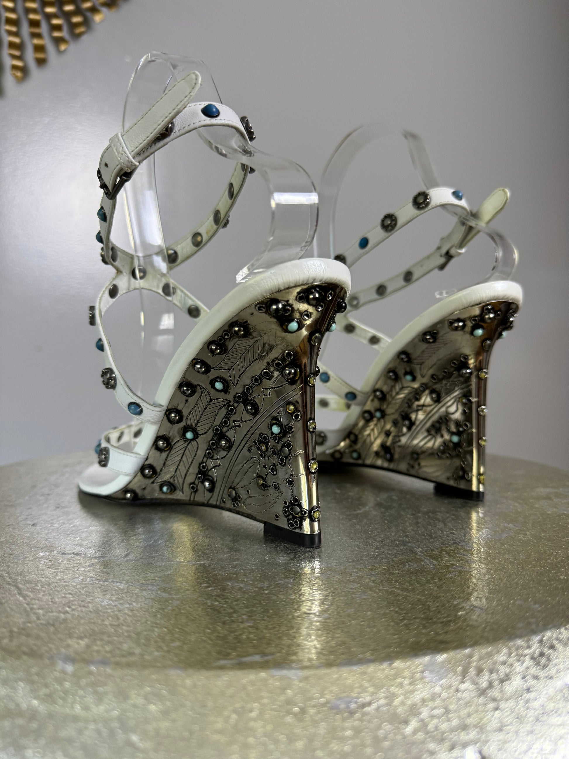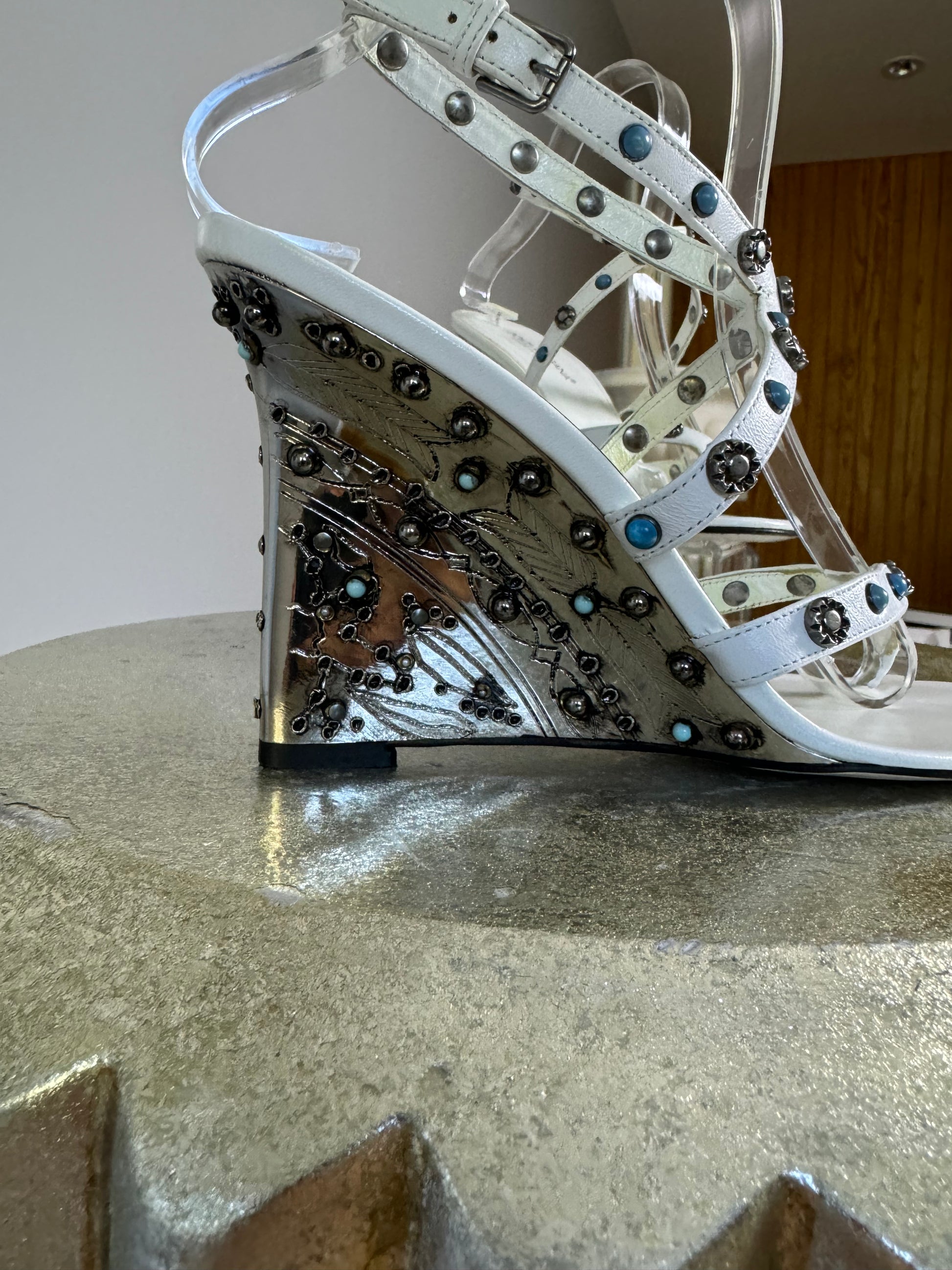 Dolce & Gabbana - White Leather Wedge Sandal With Silver Embellishment