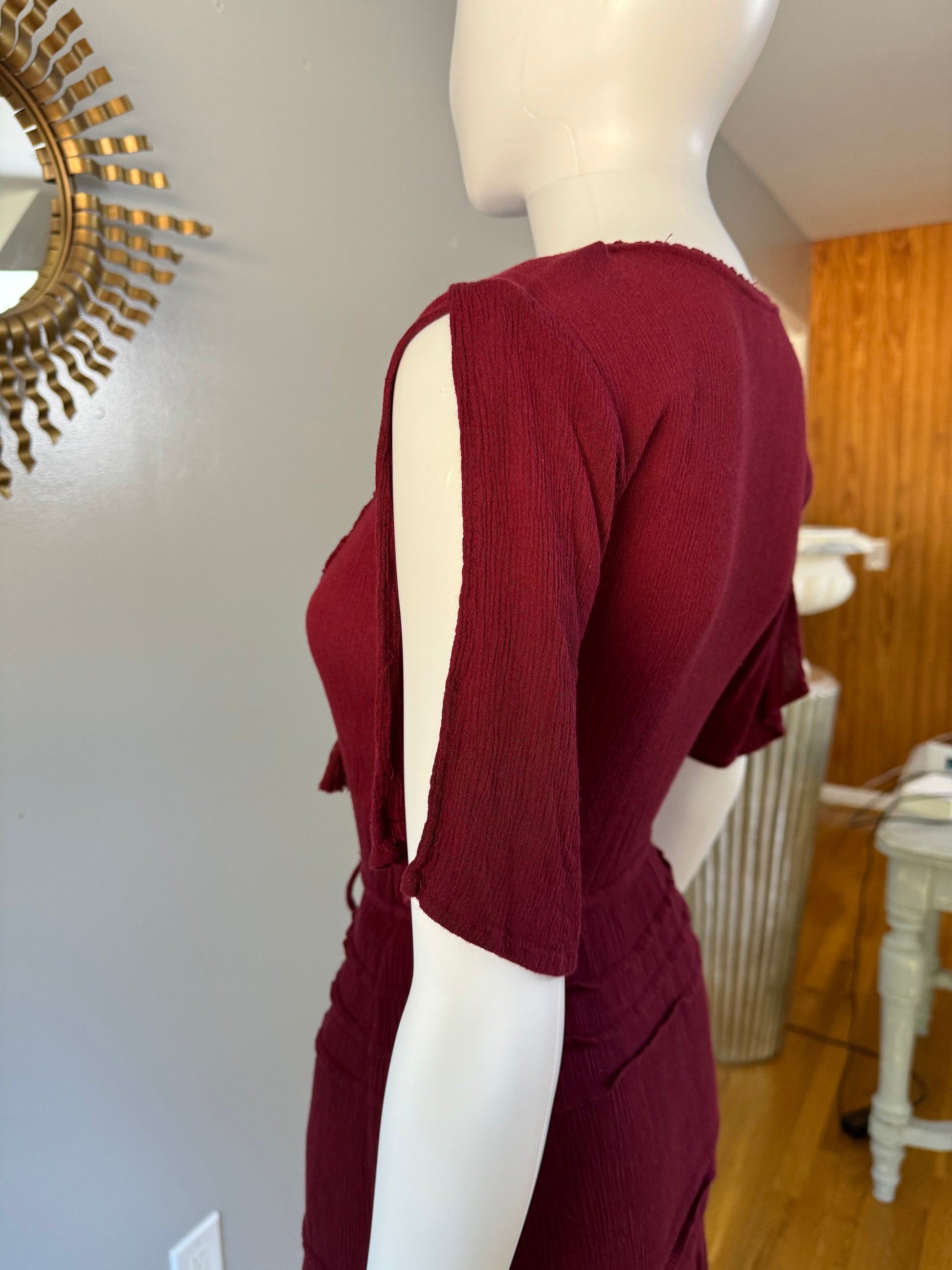 As the sun sets, slip on the Santa Fe Sway Burgundy Crochet Maxi Dress and get ready to move!