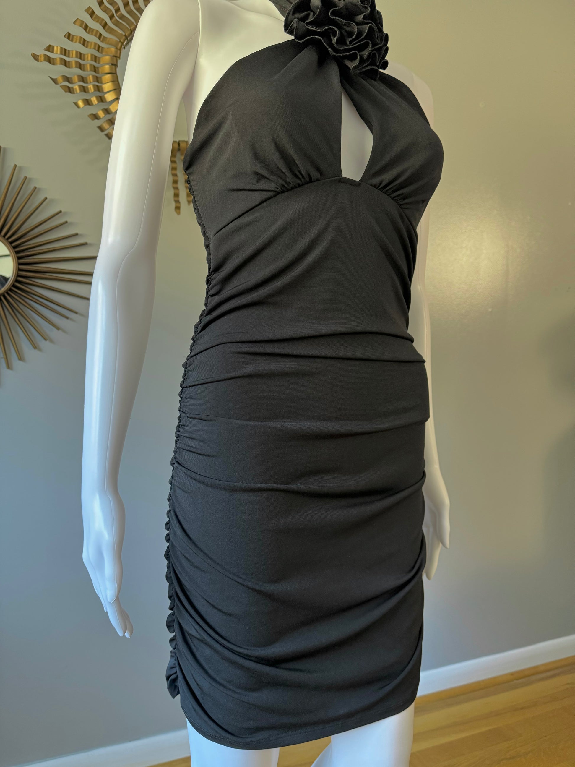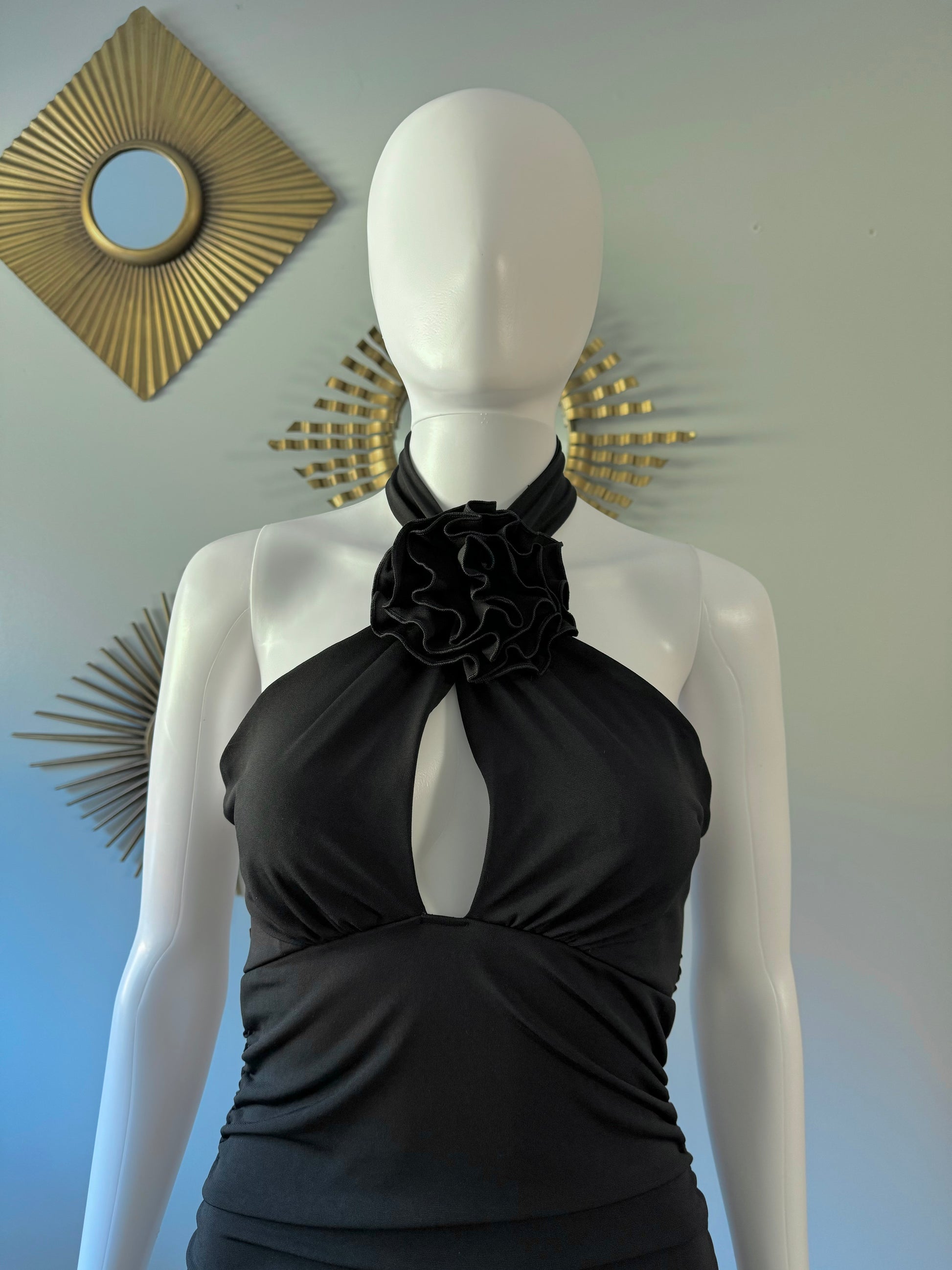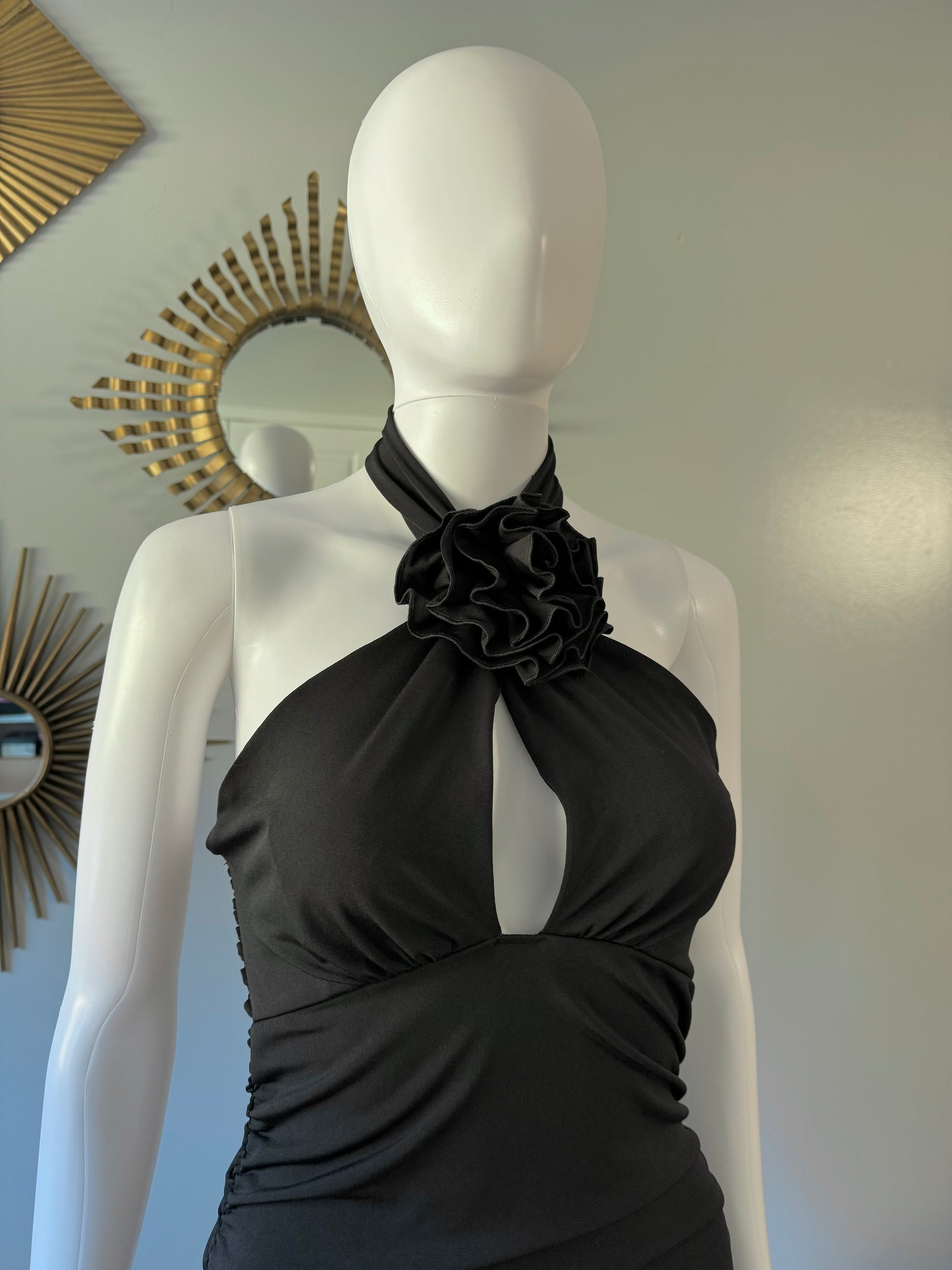 Haz una entrada elegante a la fiesta luciendo este vestido fruncido con detalle de flores de MANGO. Confeccionado con un tejido fluido, este vestido corto presenta cuello halter, tirantes cruzados, abertura delantera, espalda abierta y forro interior.