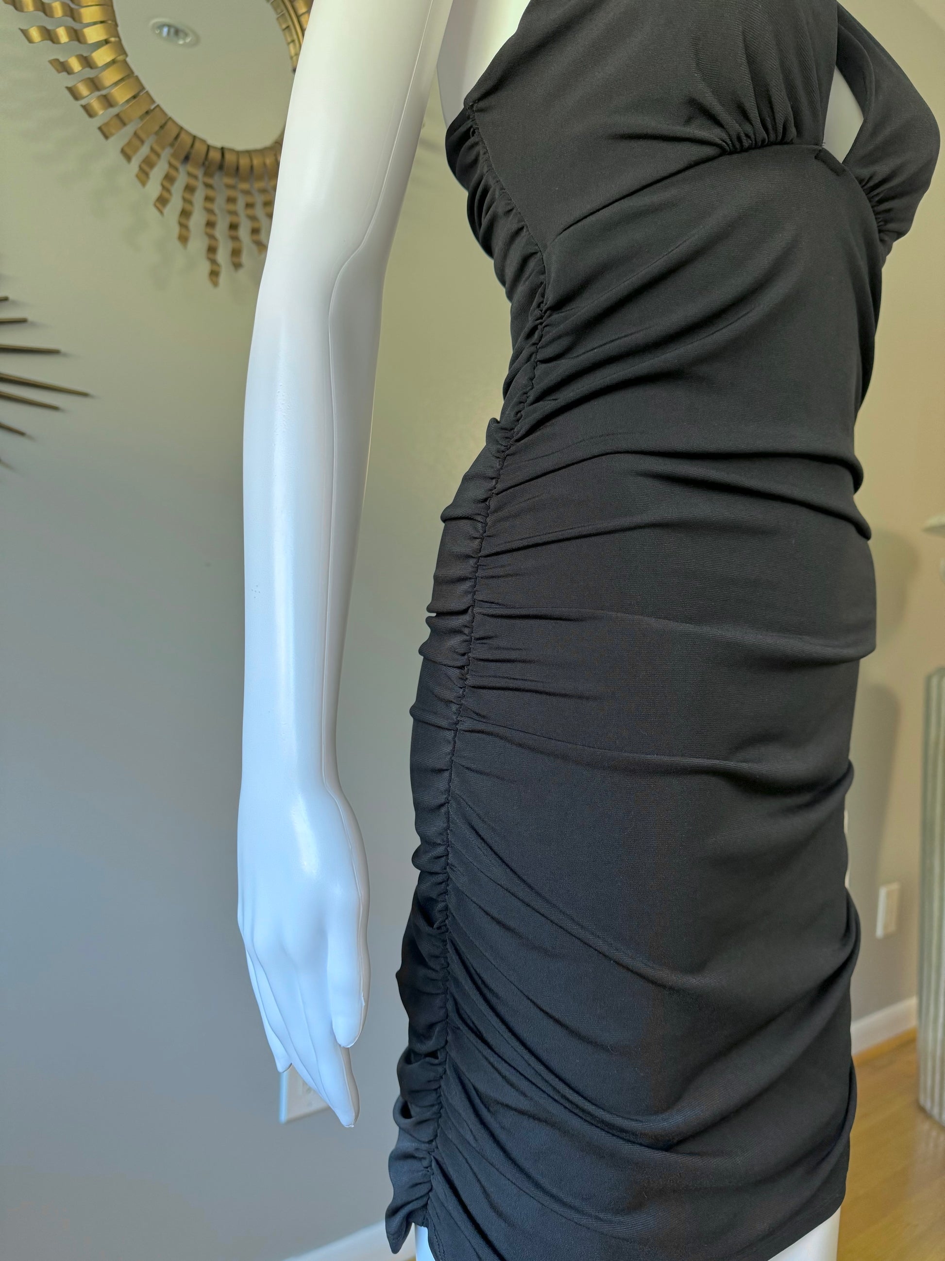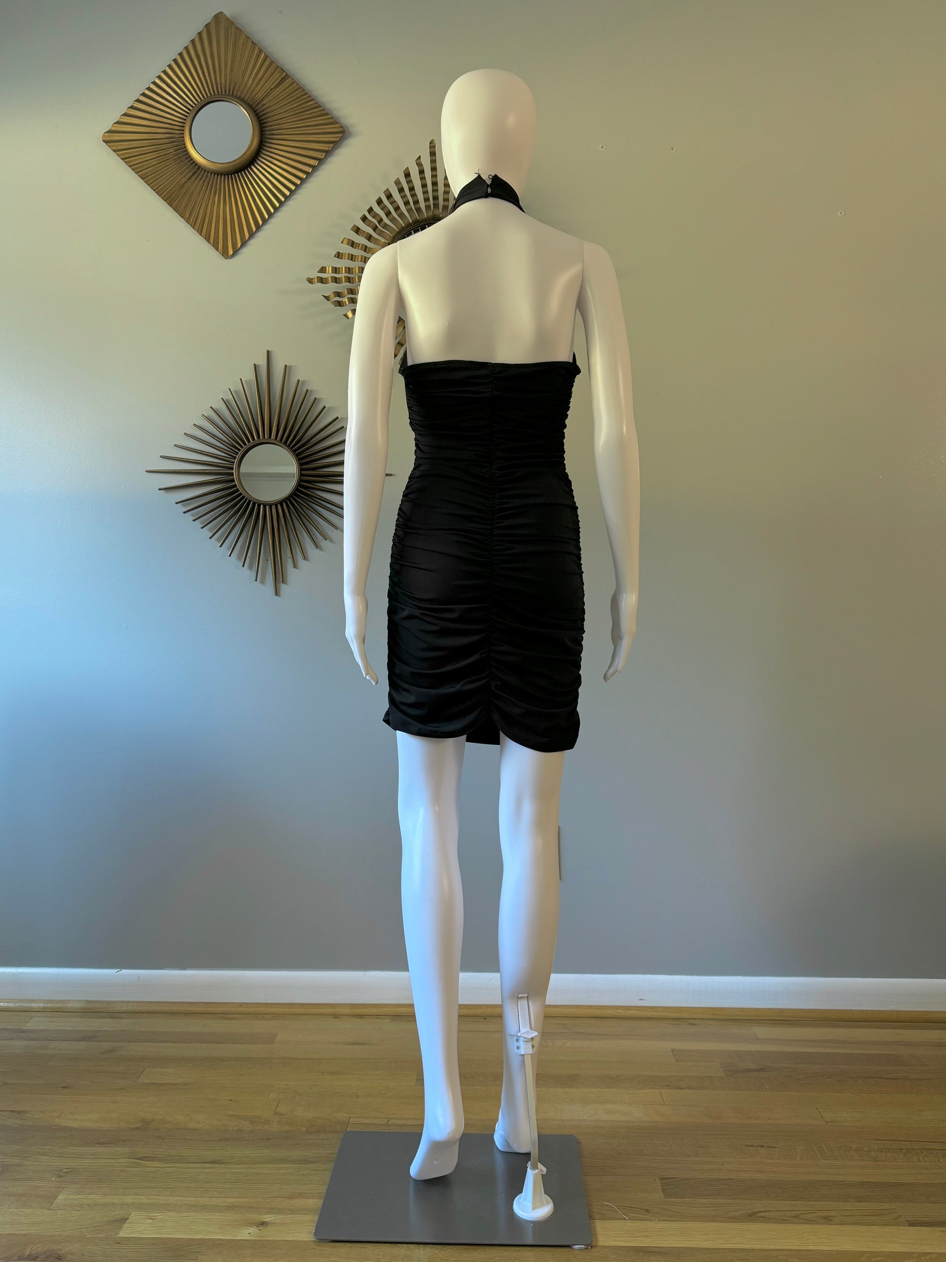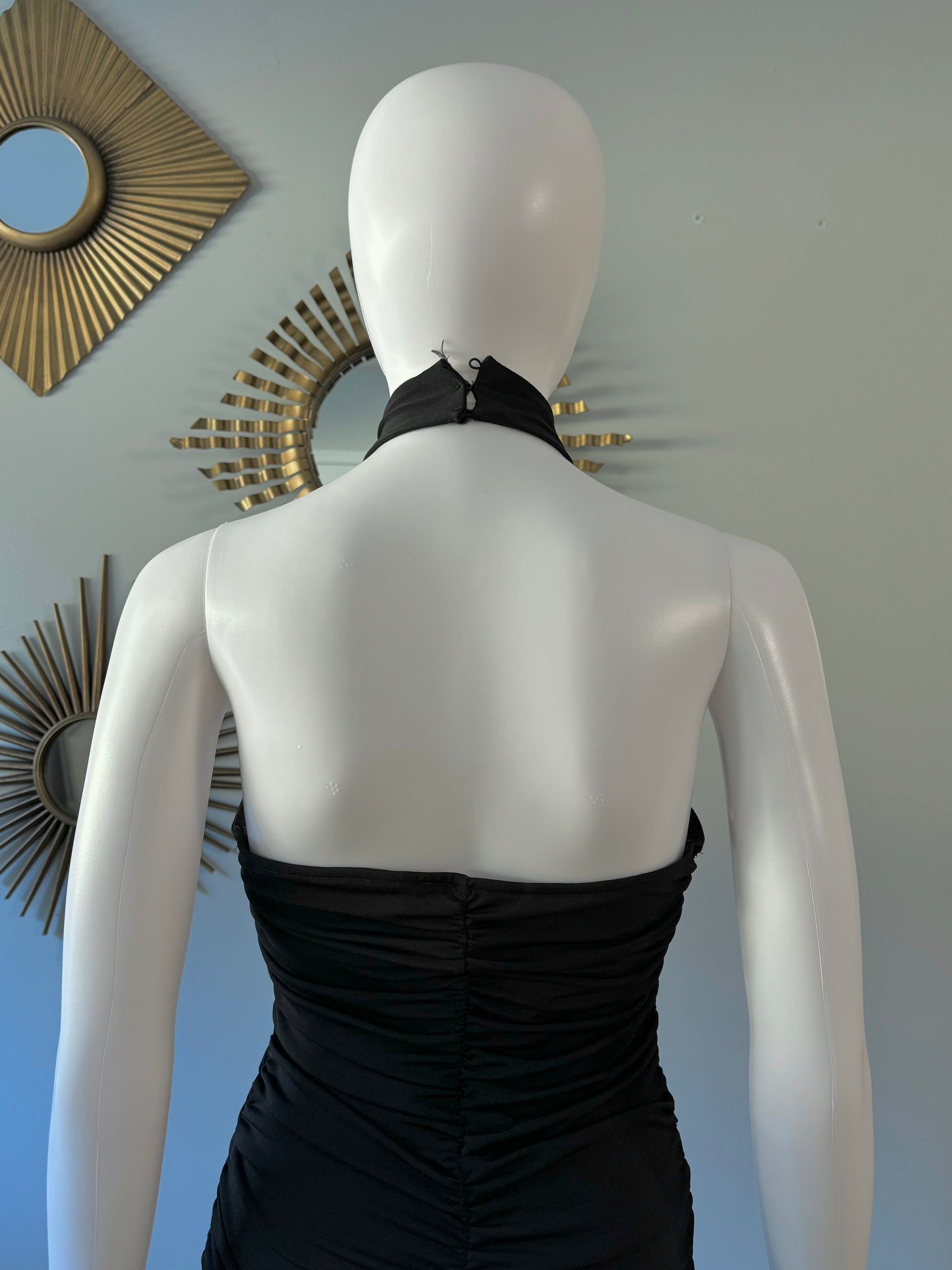 Haz una entrada elegante a la fiesta luciendo este vestido fruncido con detalle de flores de MANGO. Confeccionado con un tejido fluido, este vestido corto presenta cuello halter, tirantes cruzados, abertura delantera, espalda abierta y forro interior.
