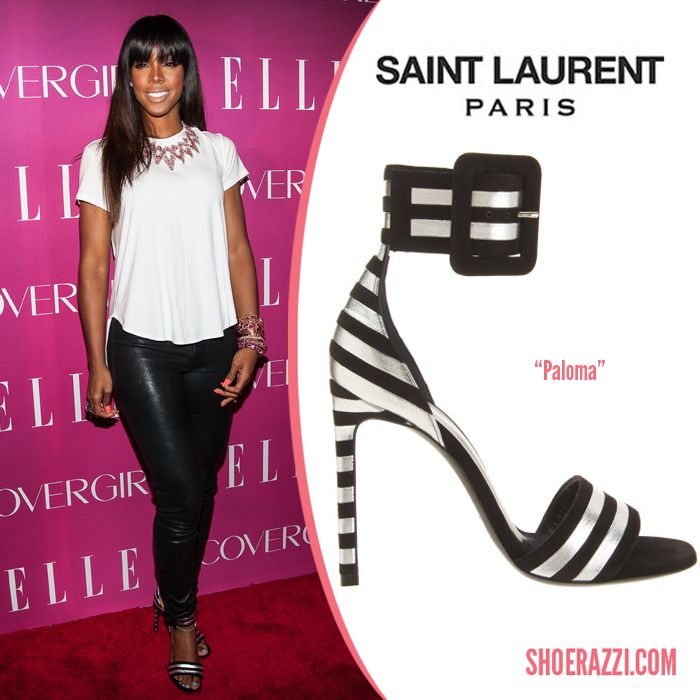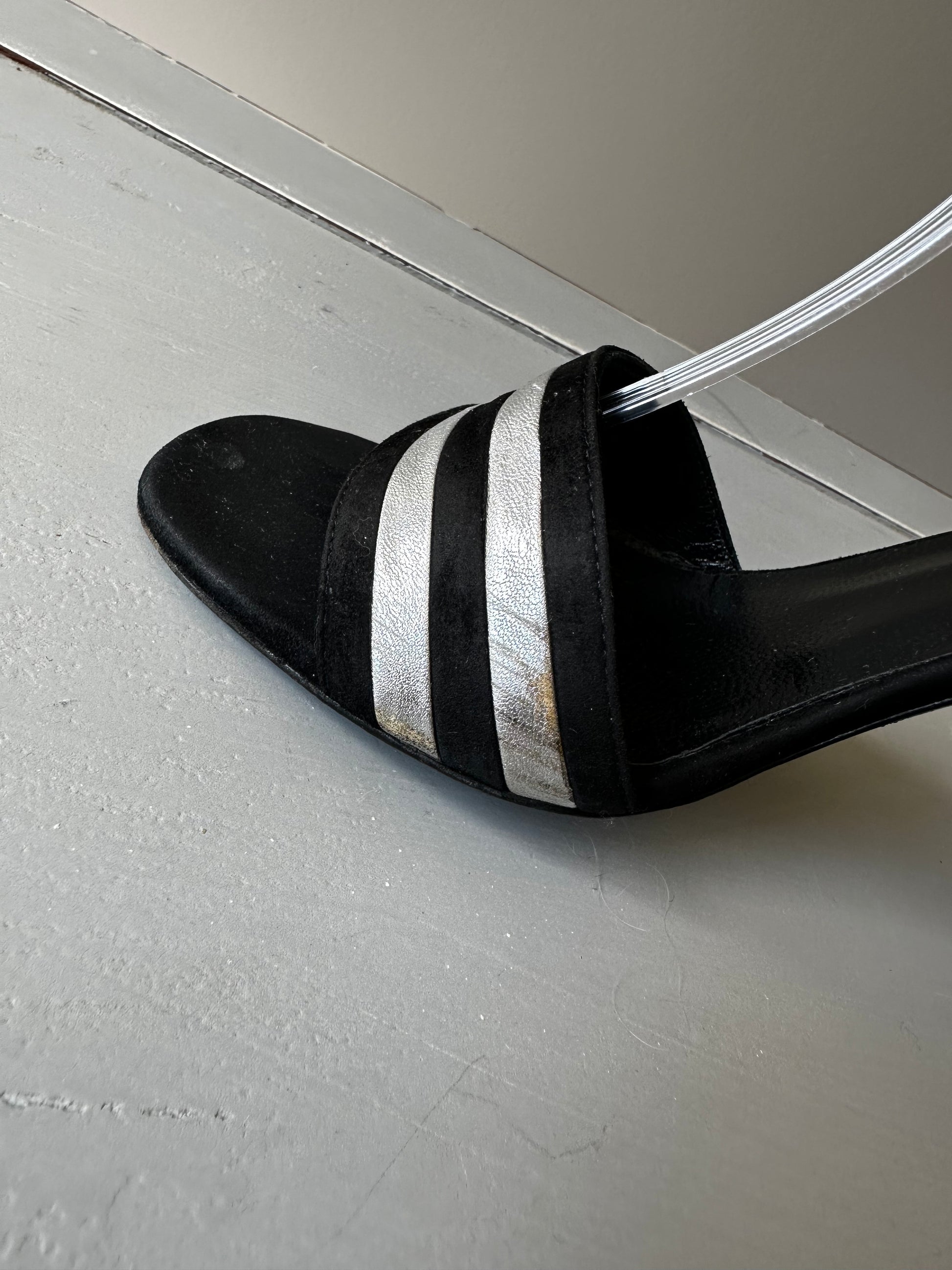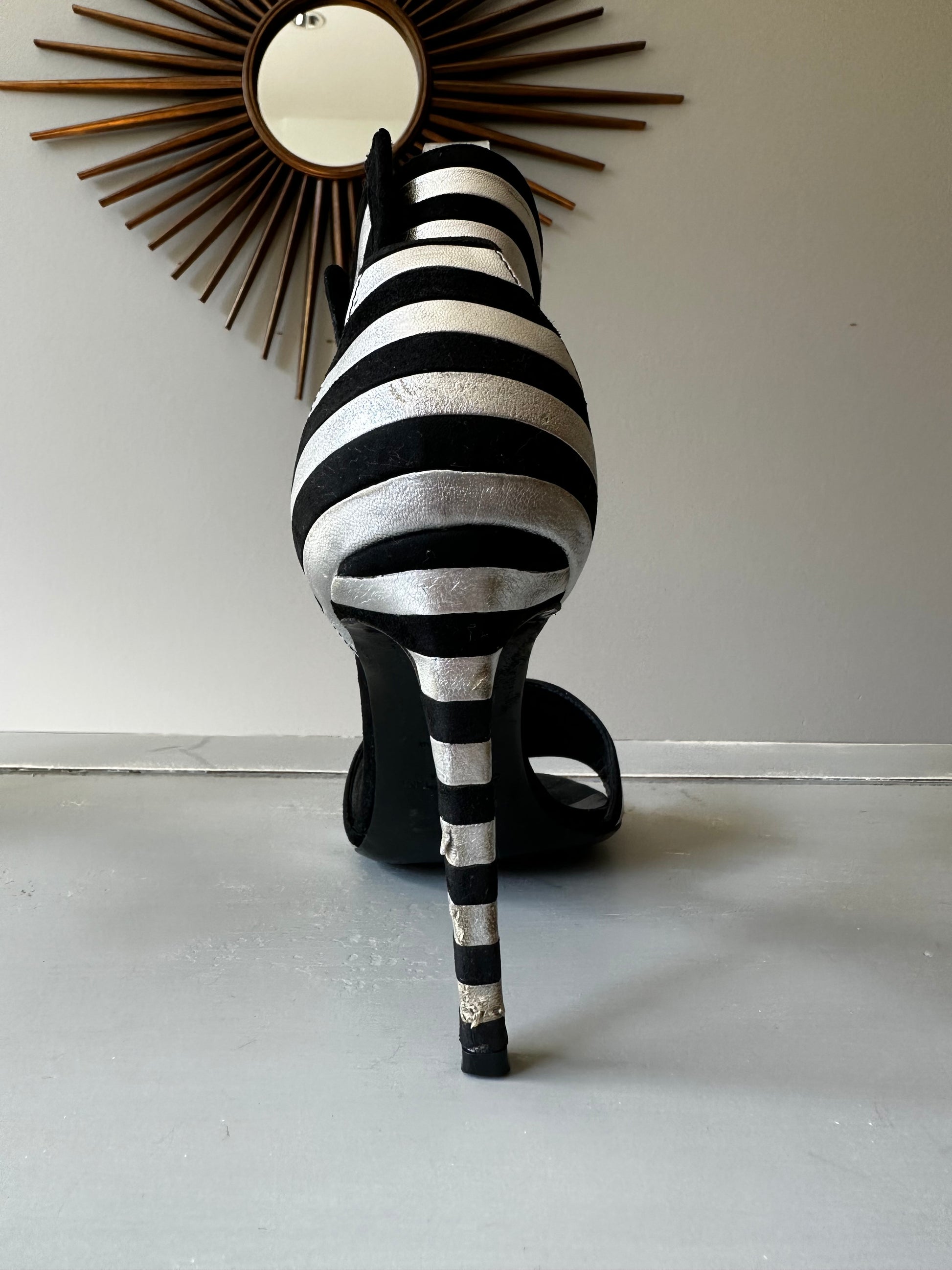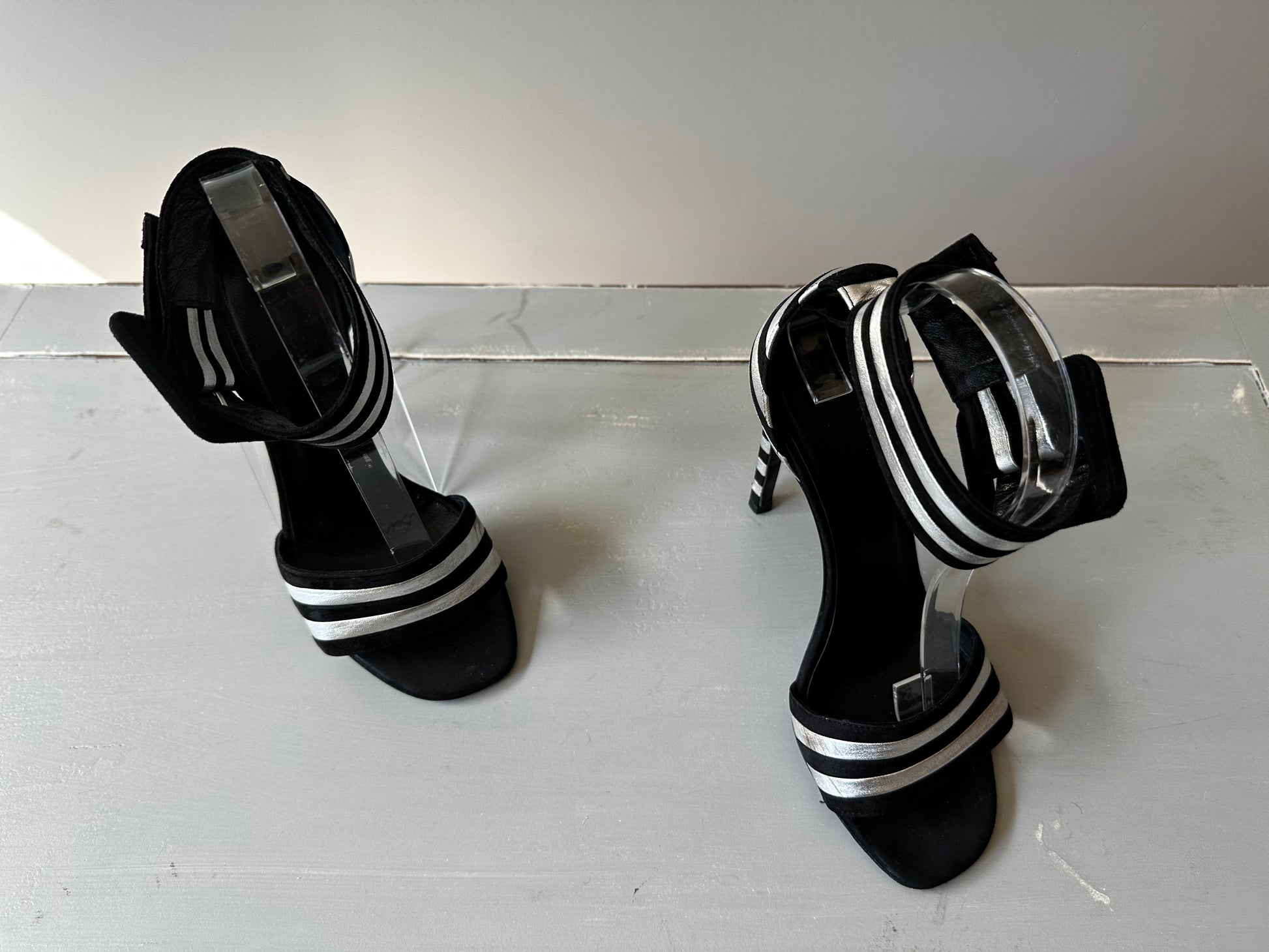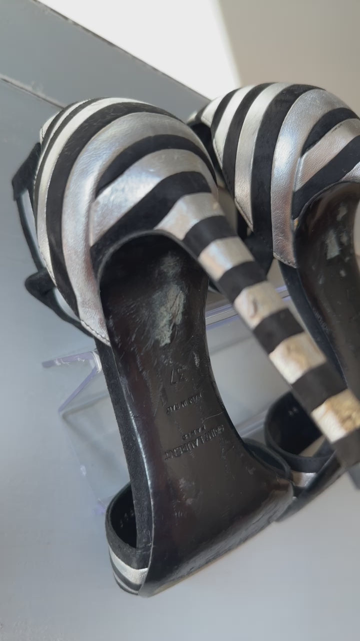 Saint Laurent - Sandalias Paloma de cuero negro y plateado con tira al tobillo a rayas