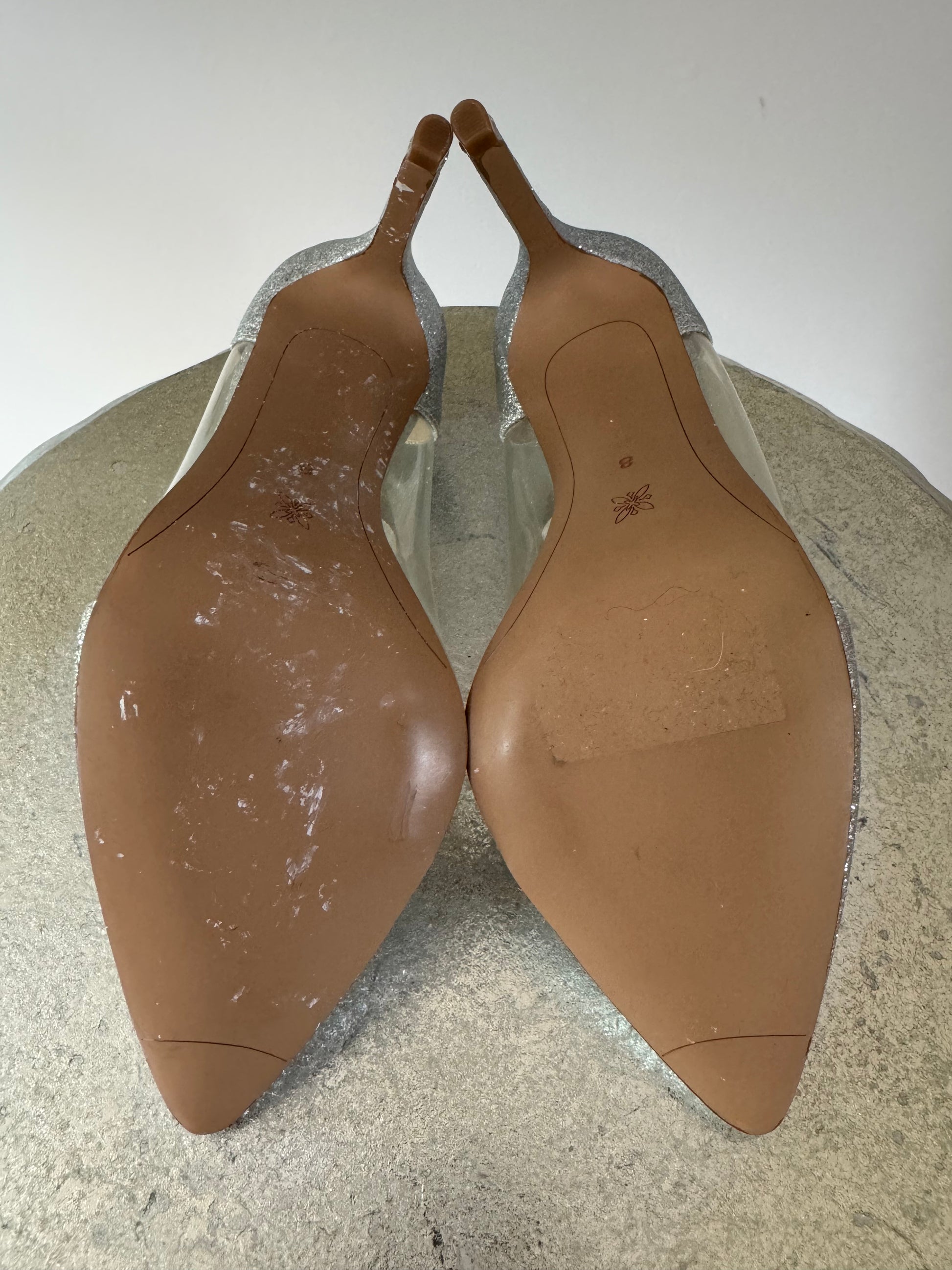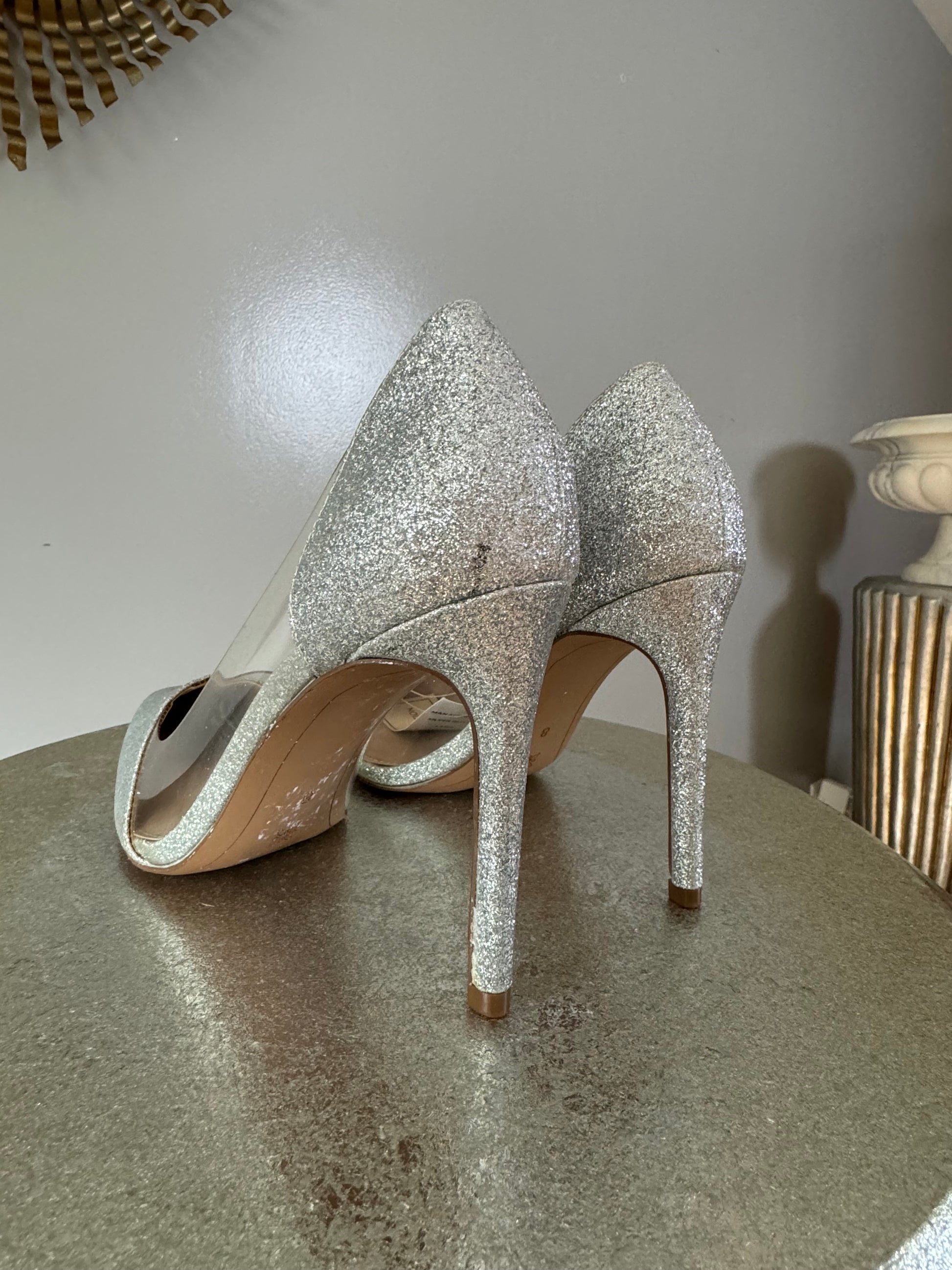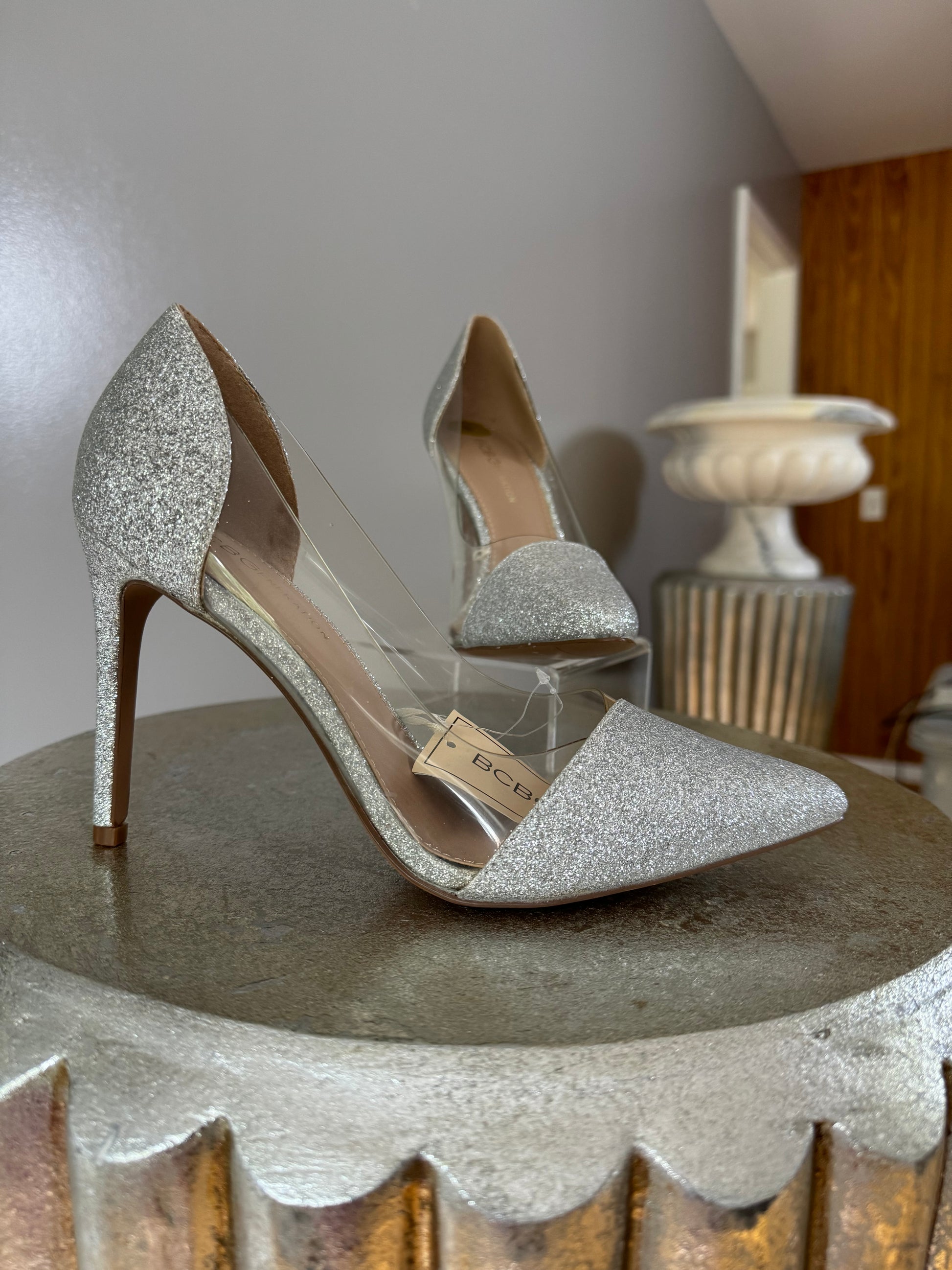These stiletto pumps feature a flexible sole, rhinestone embellishments and clear vinyl side panels.