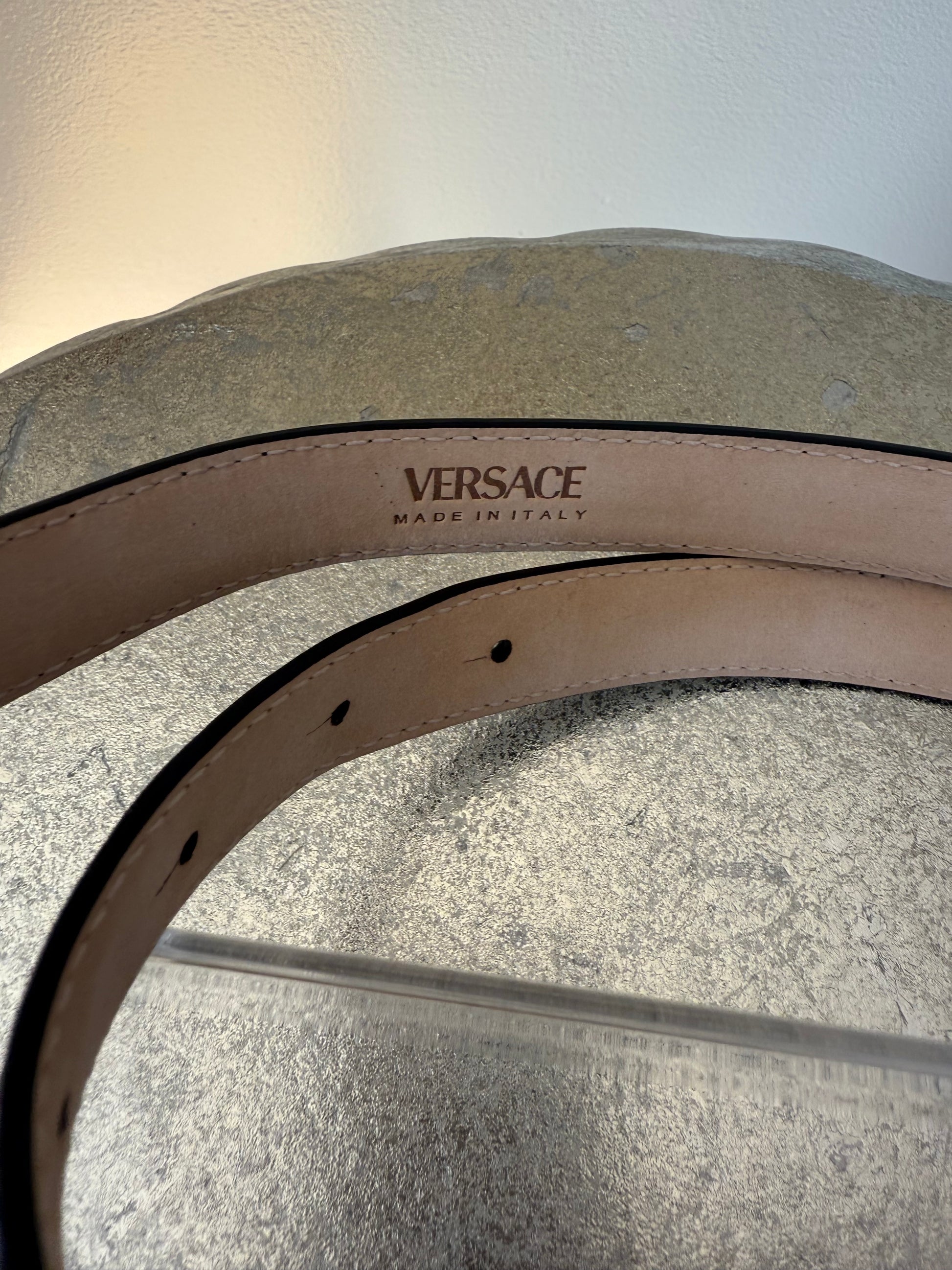 An Italian leather belt by Versace flaunts a distinctive goldplated buckle in a slim design with luxe suede interior.