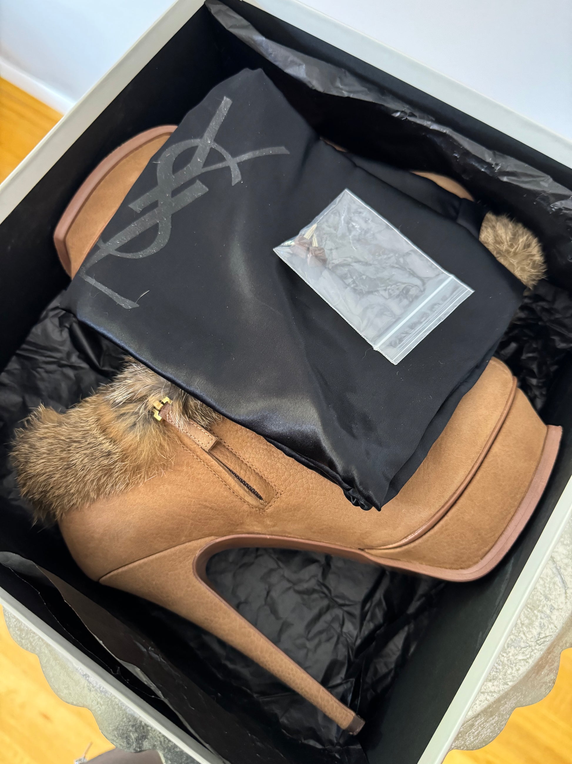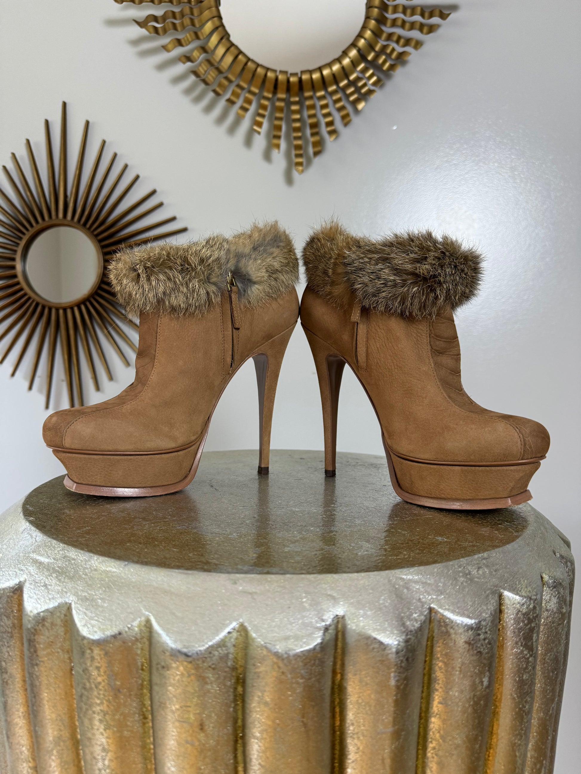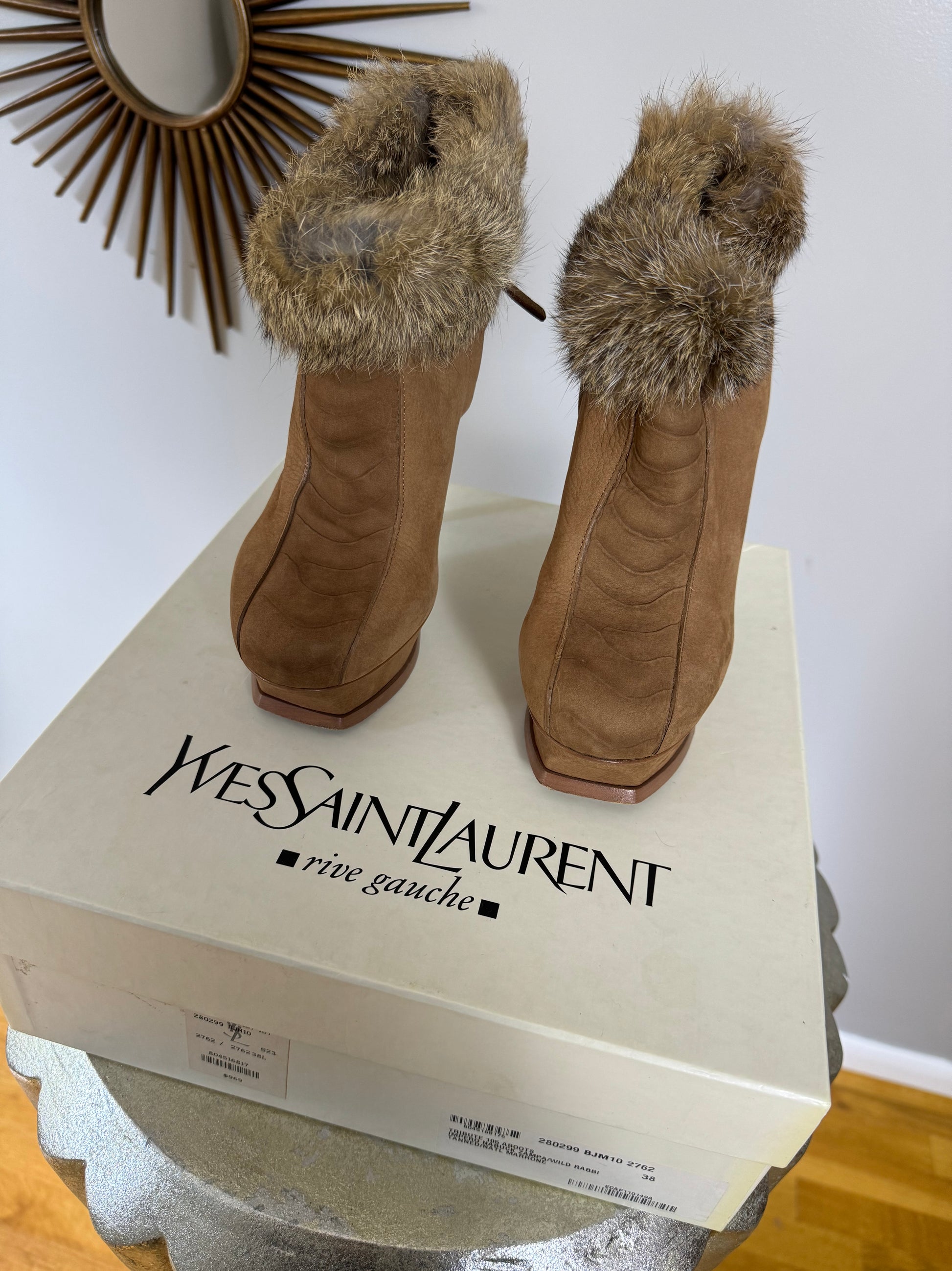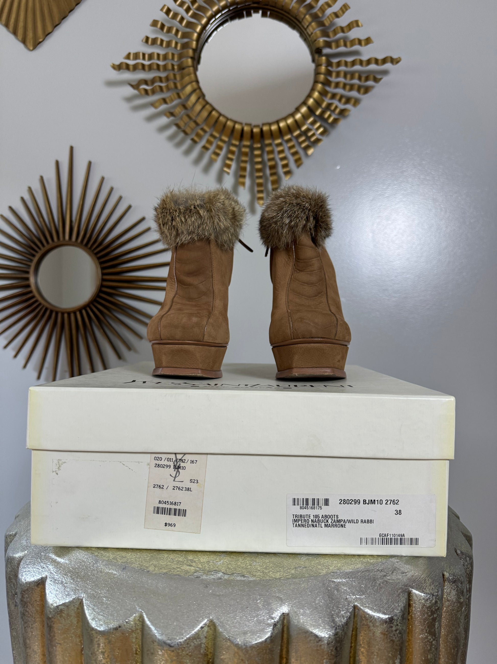 YSL - Tan Tribute Suede Booties With Fur Cuff