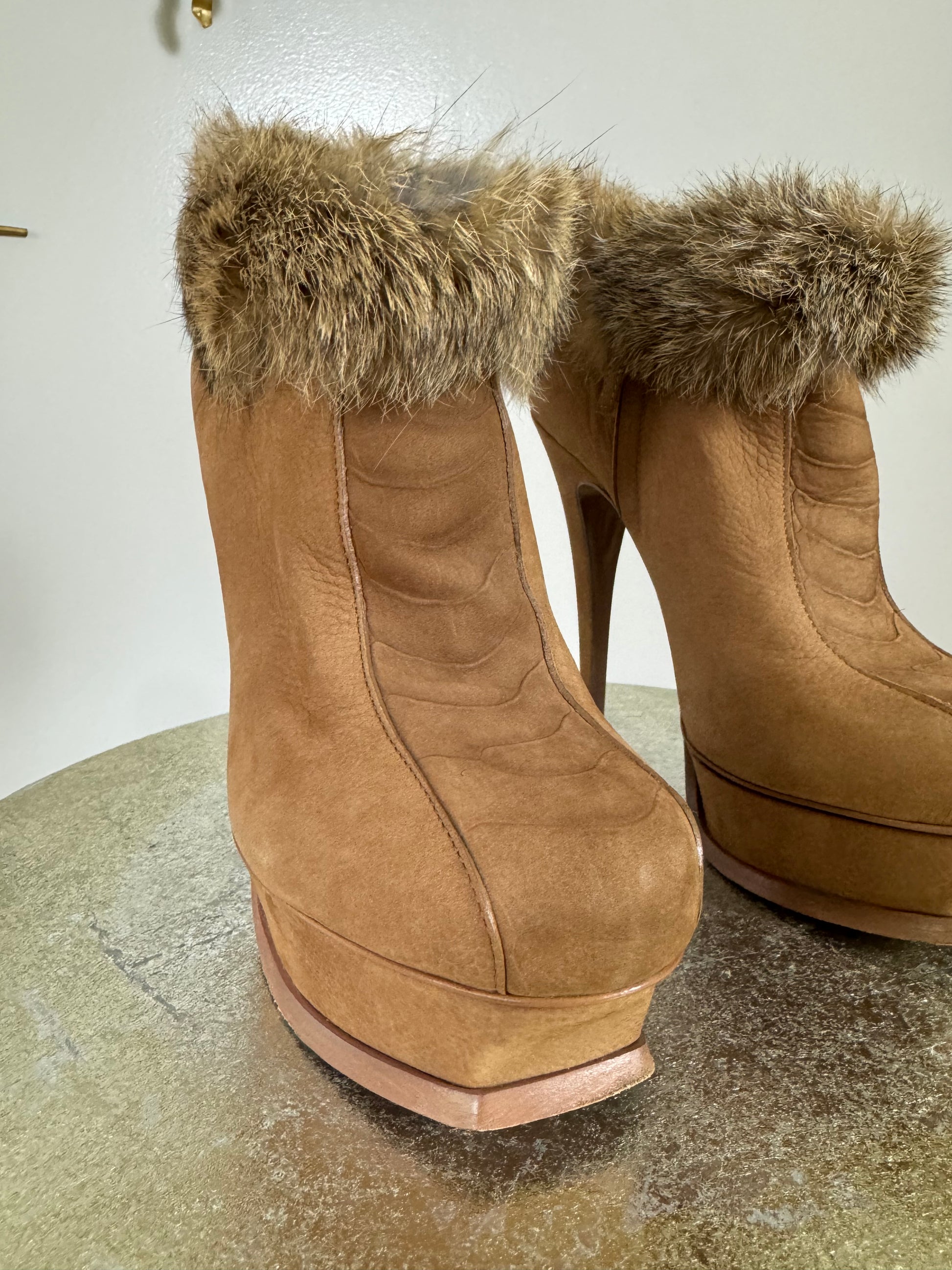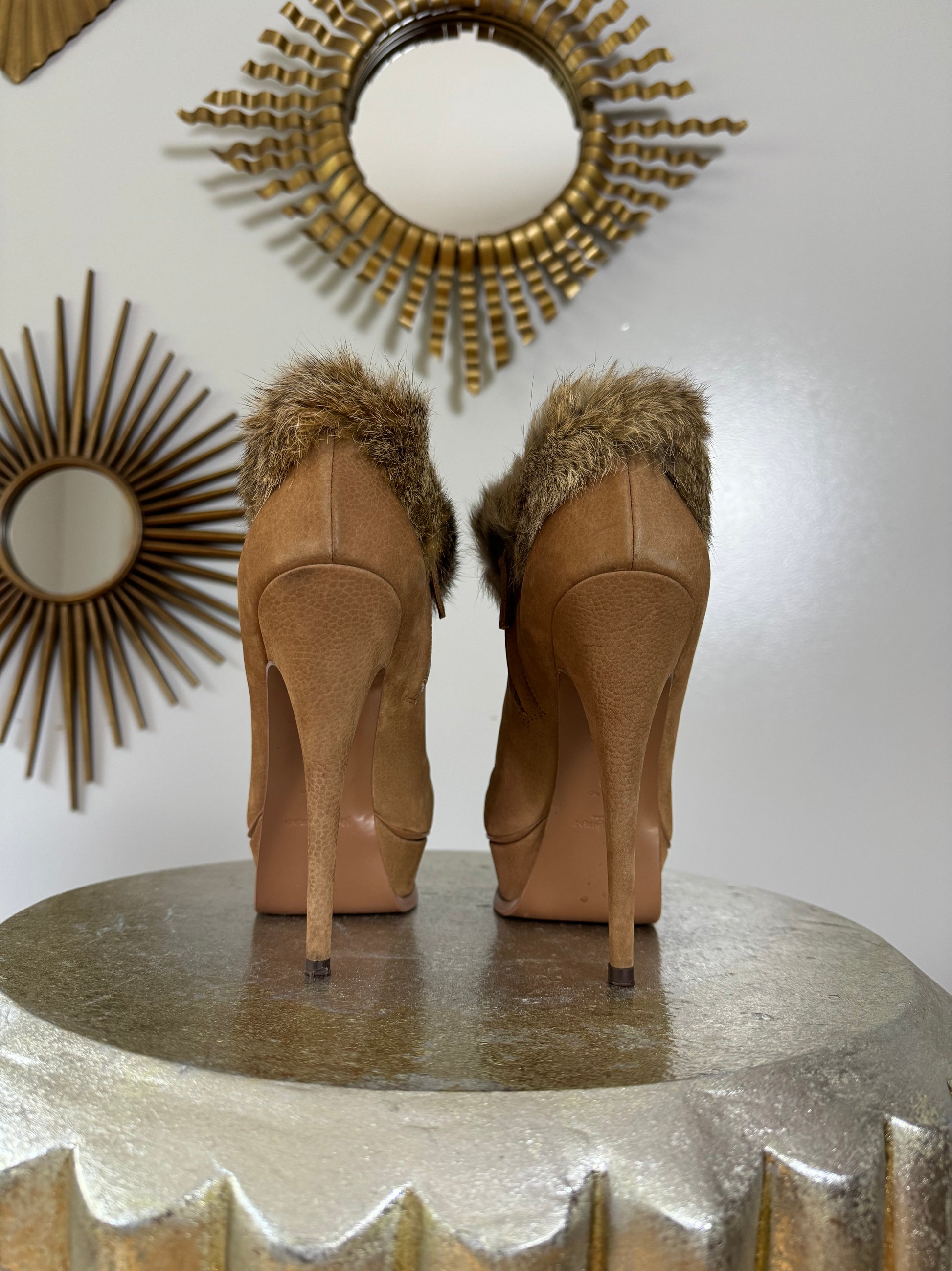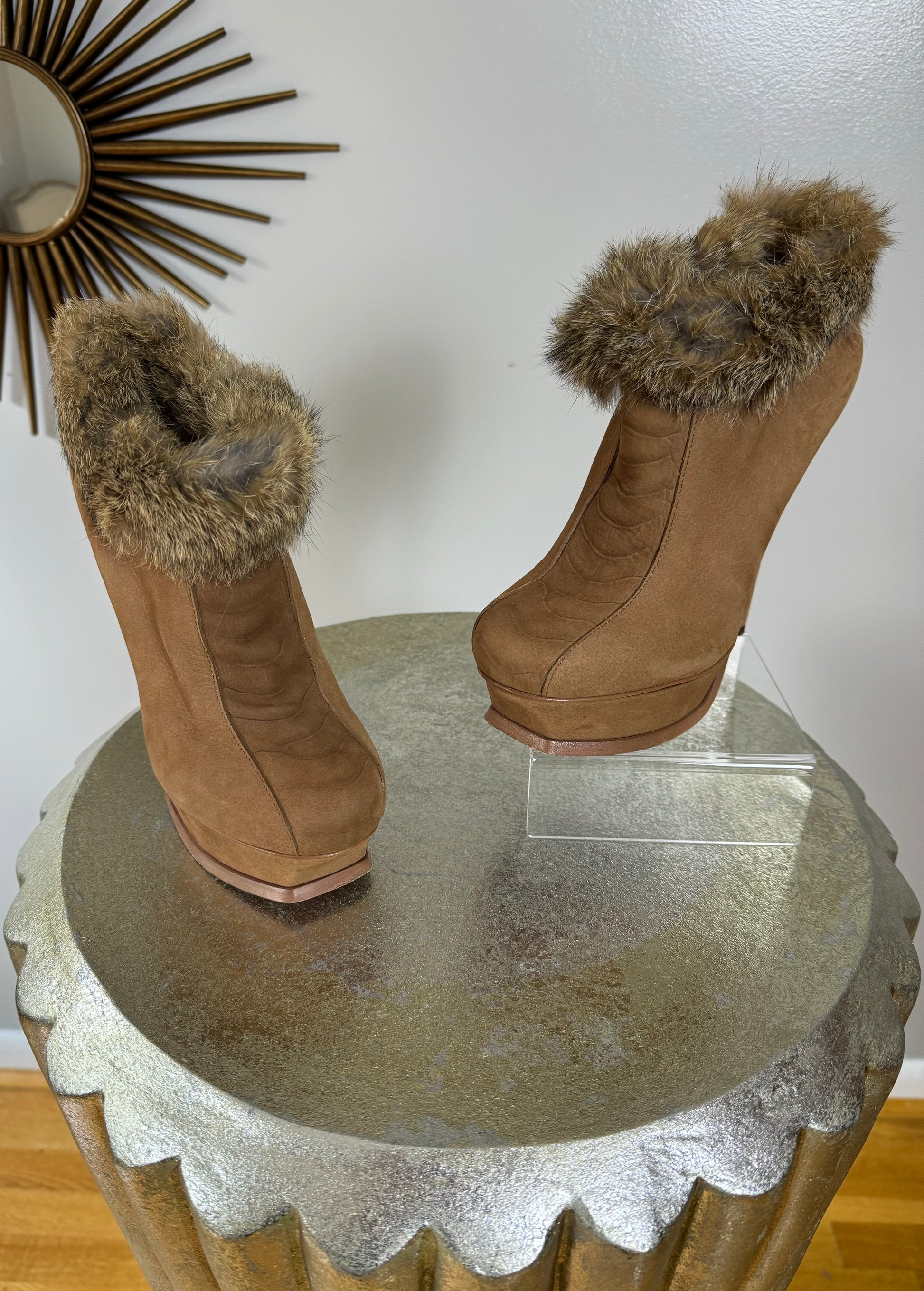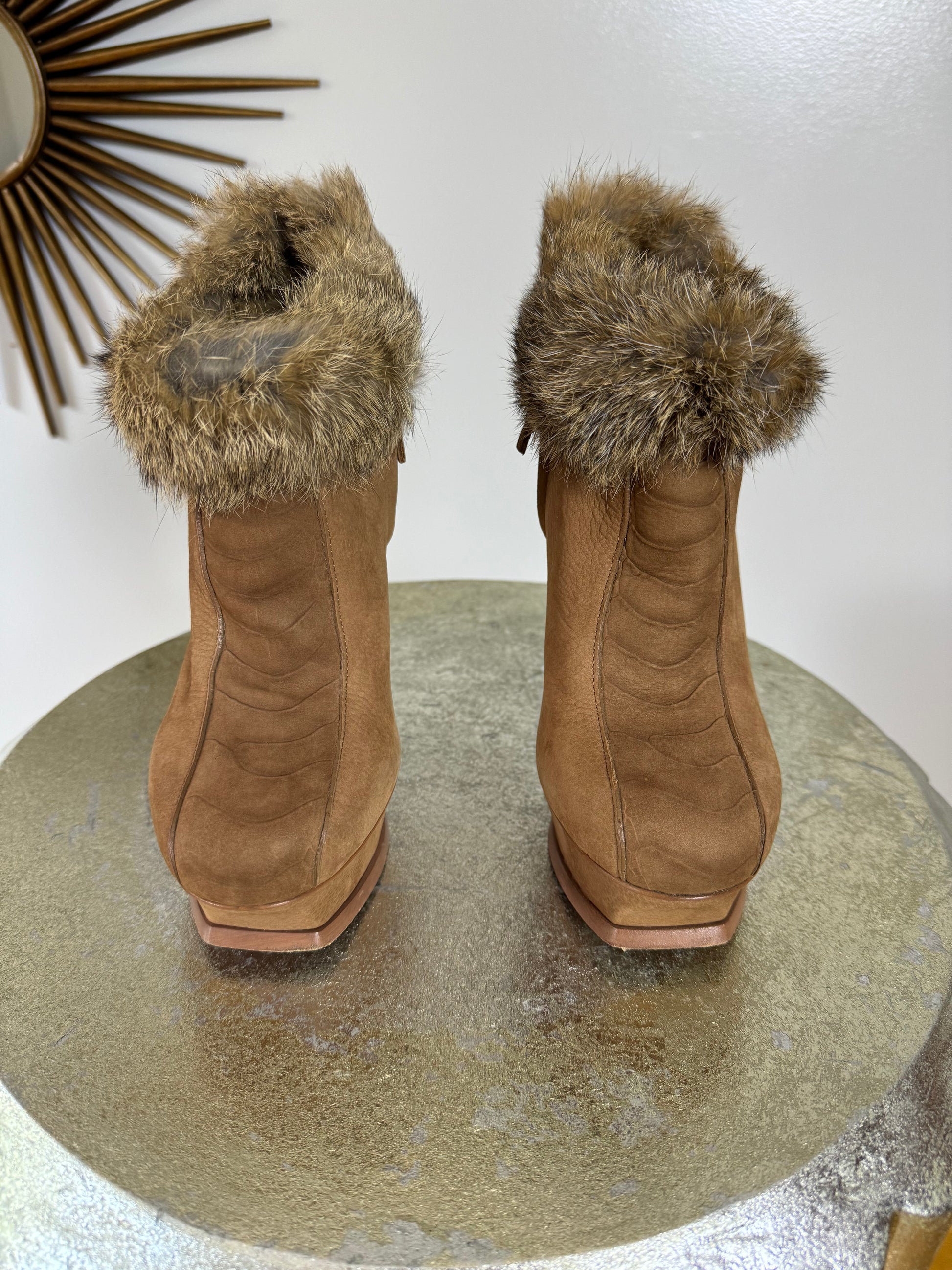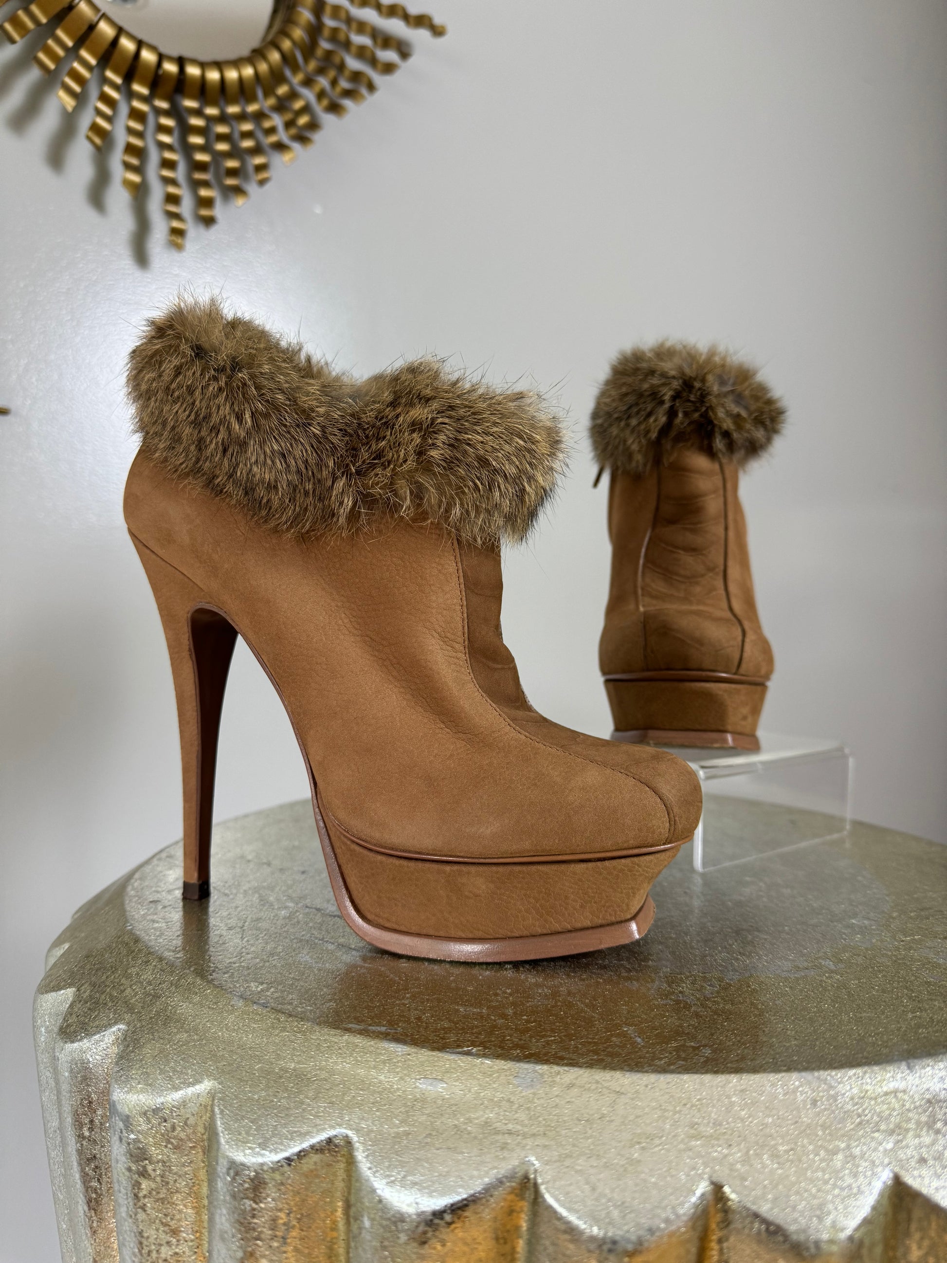 YSL - Tan Tribute Suede Booties With Fur Cuff