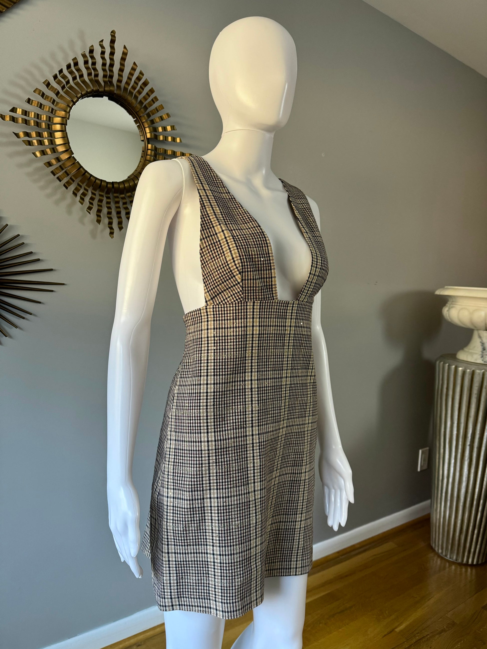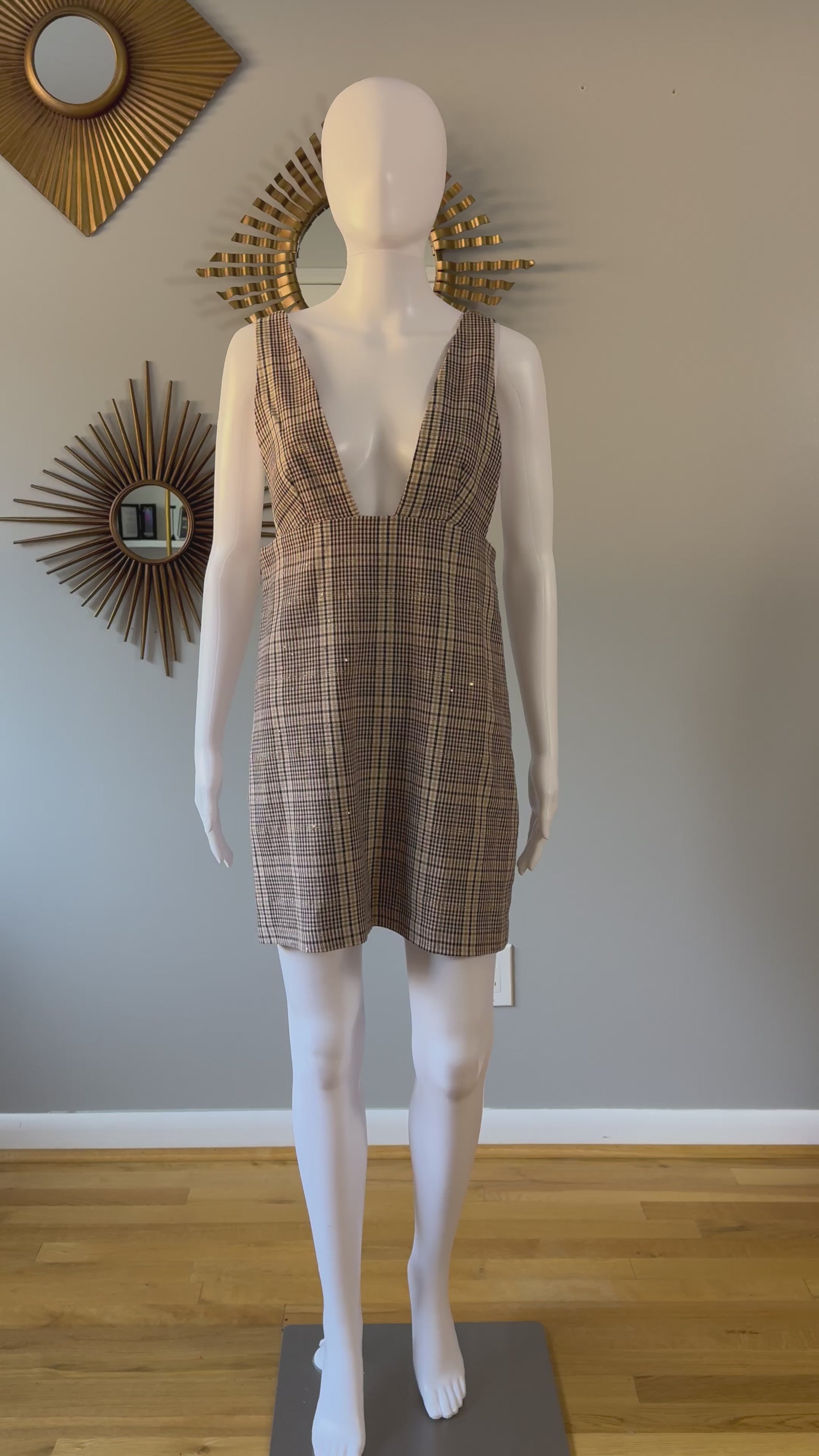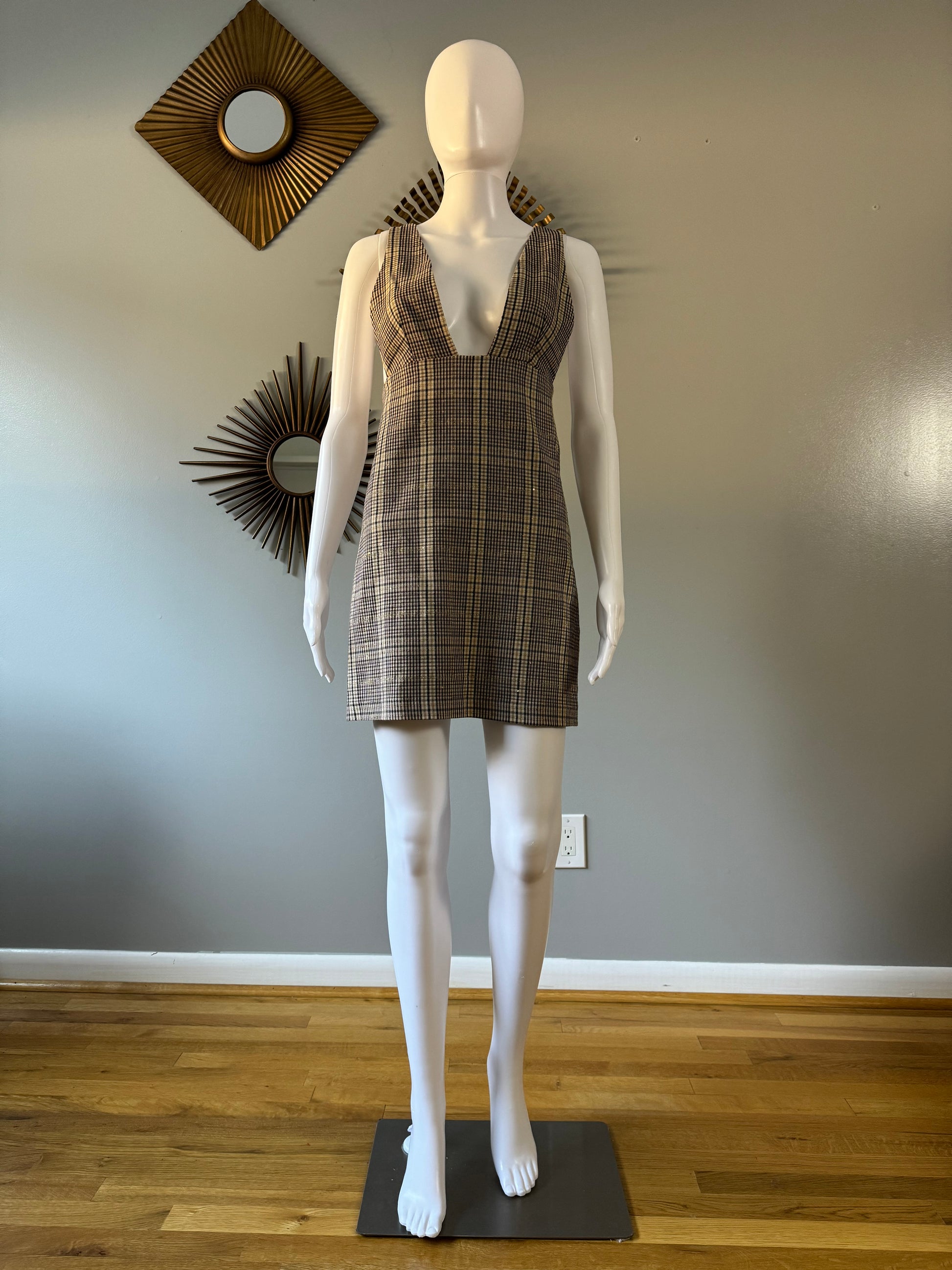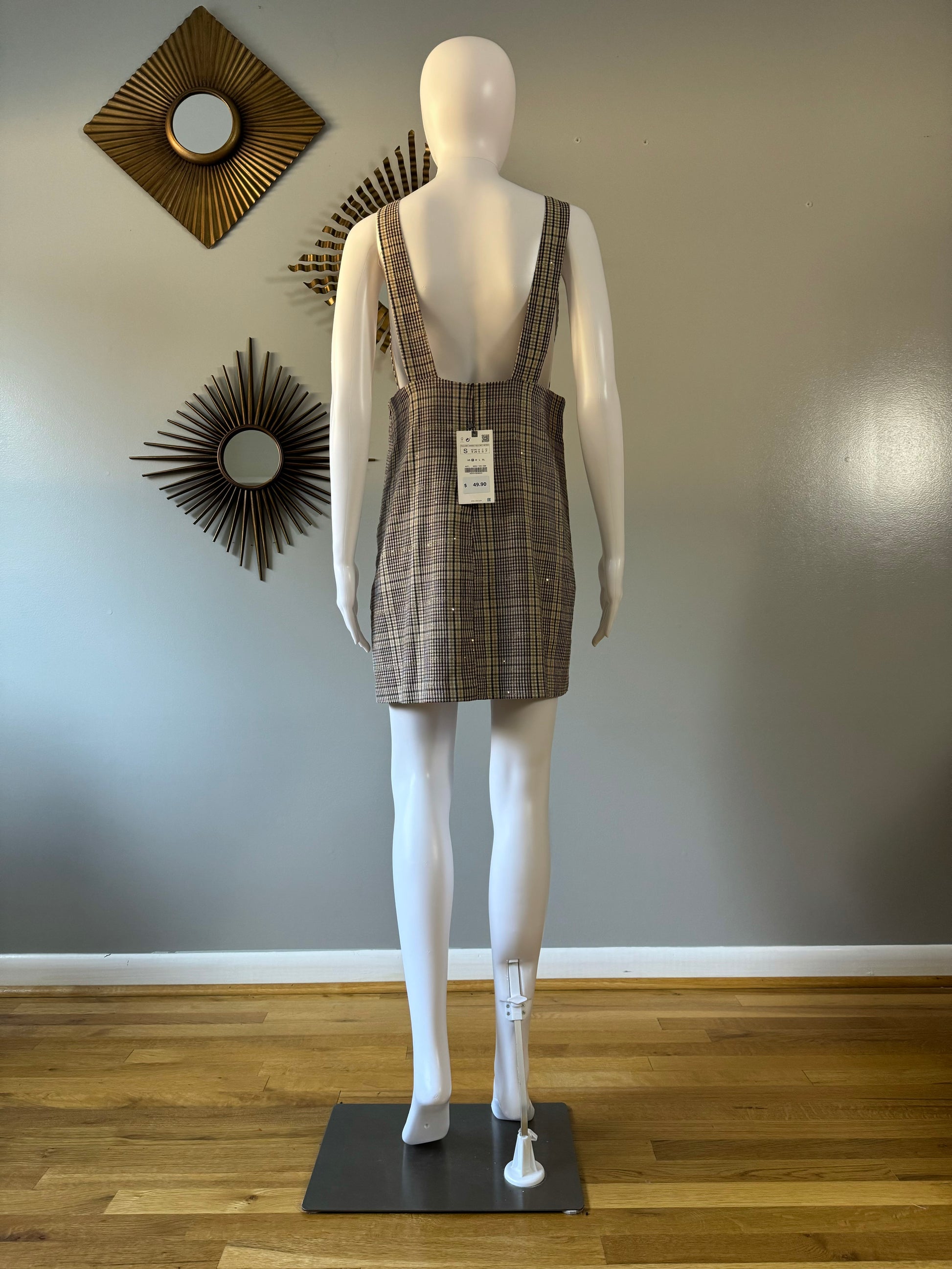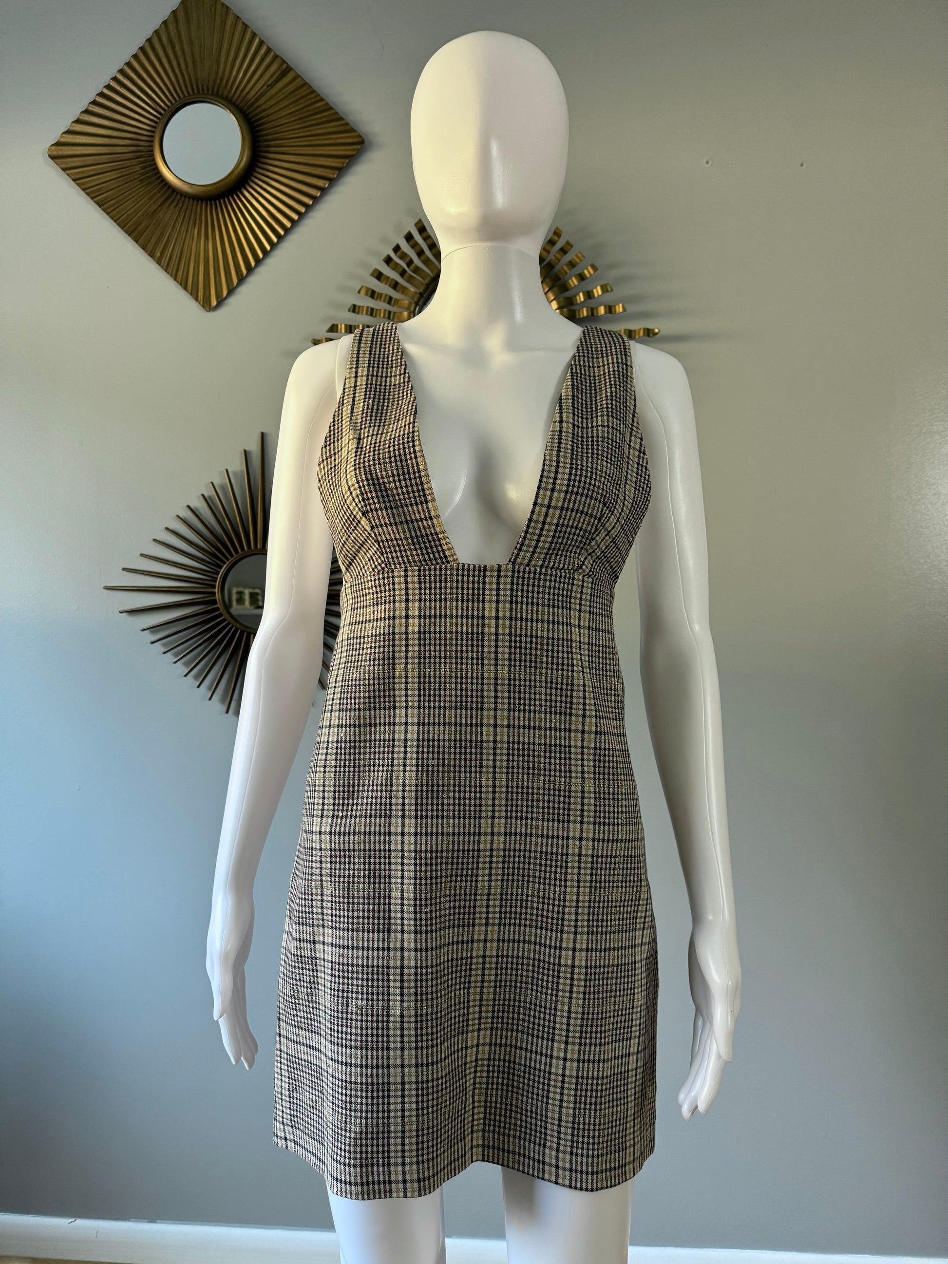ZARA - Vestido pichi de cuadros marrón con escote en pico pronunciado