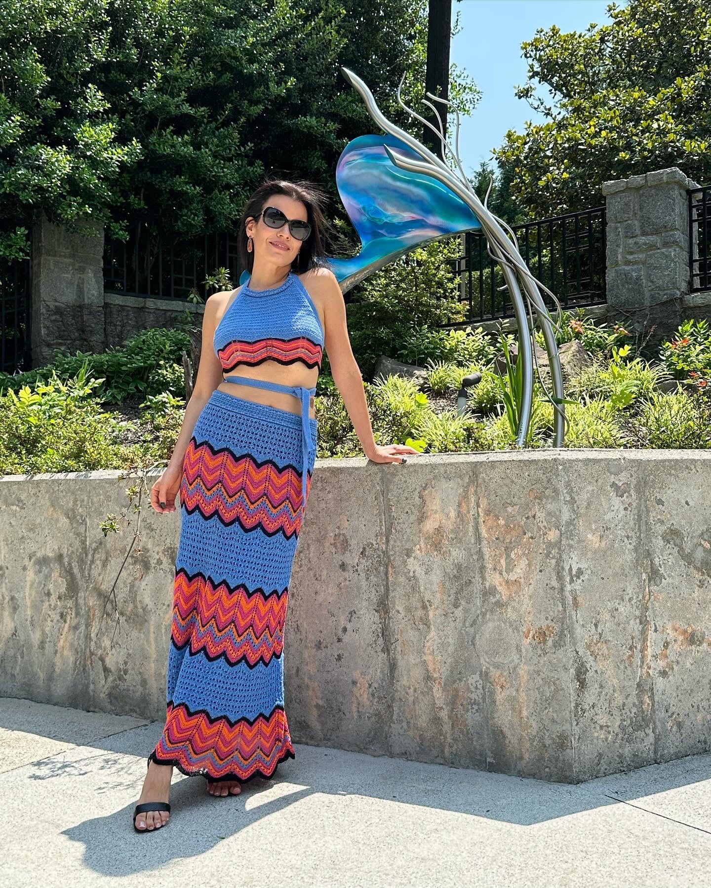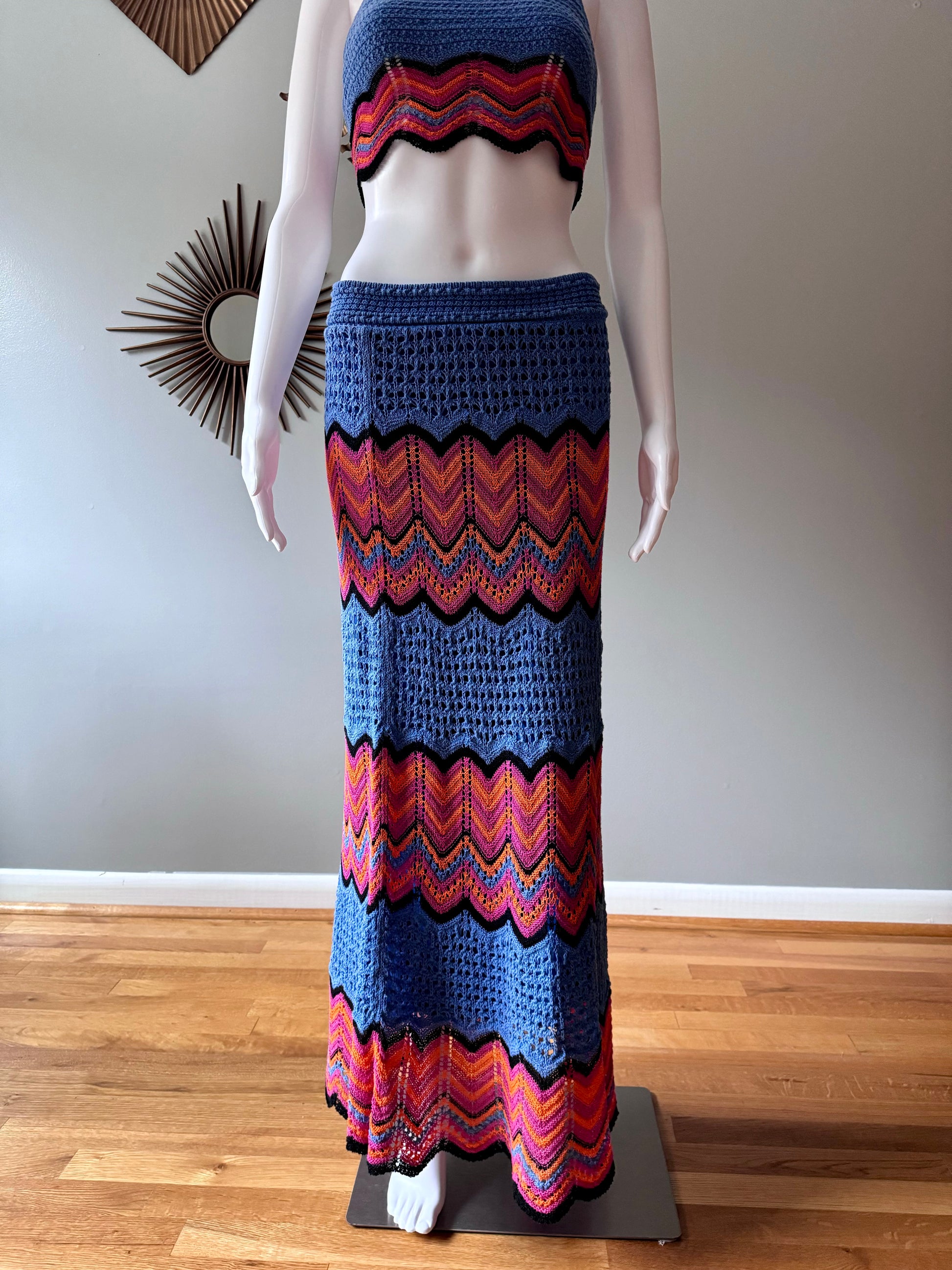 Con forma de cinturilla elástica, se ciñe al cuerpo alrededor de la cintura y las caderas y luego cae suavemente hasta un dobladillo largo ligeramente recortado. También presenta un estampado en zigzag en tonos de rosa, naranja y negro, un dobladillo festoneado sutil y detalles de crochet semitransparentes.