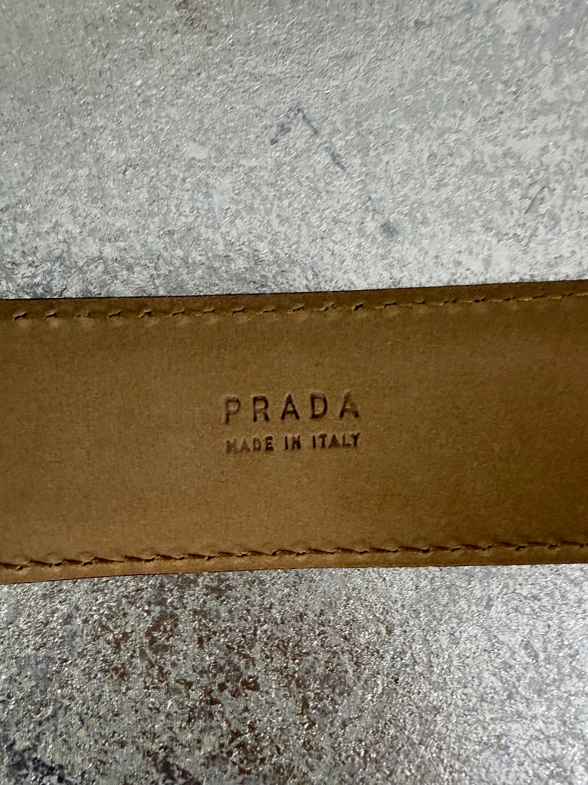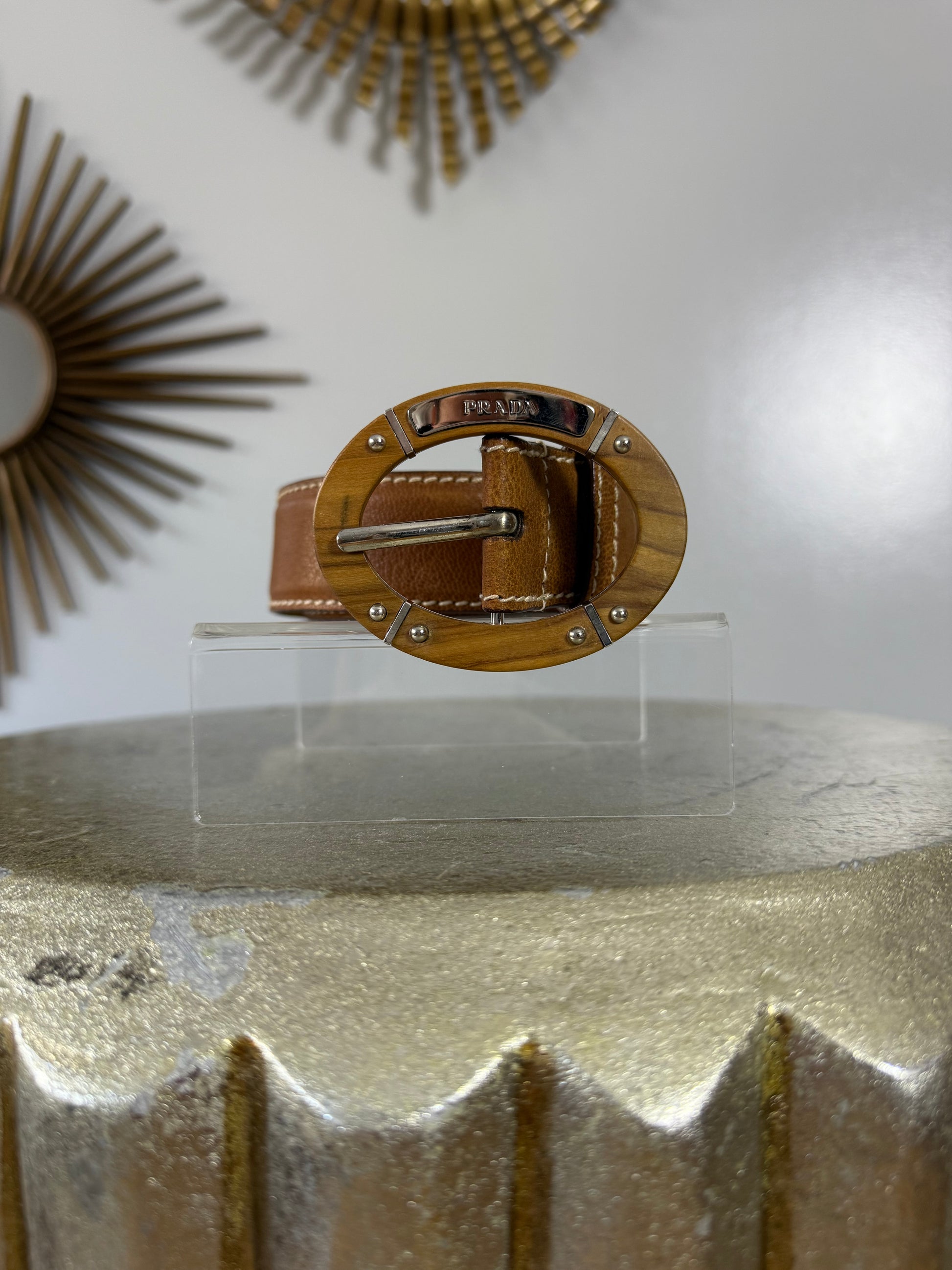 Rare Prada collector’s piece from the early 2000s "Nature" era. This belt features a stunning, sculptural oval buckle crafted from genuine polished wood, accented with a branded Prada stainless steel plate and silver-tone hardware.