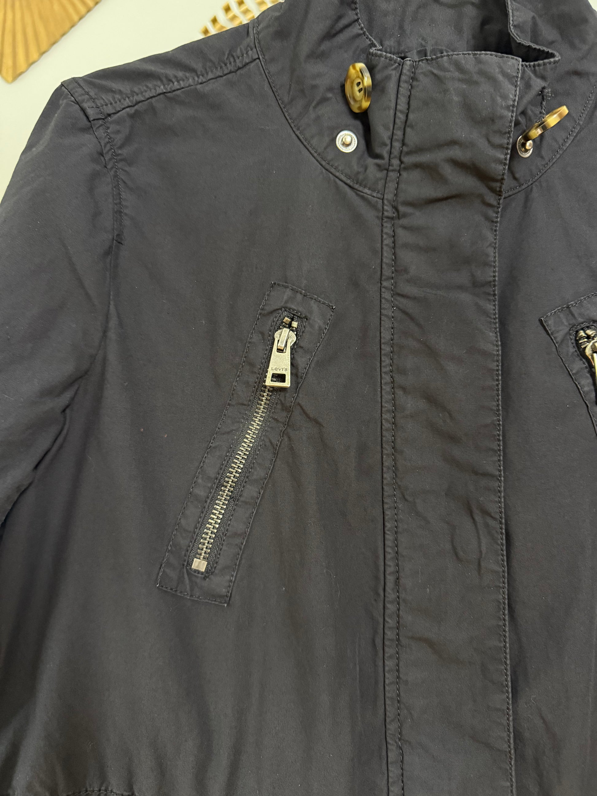 Very good pre-owned condition, but missing the detachable hoodie. And one button is a little loose.